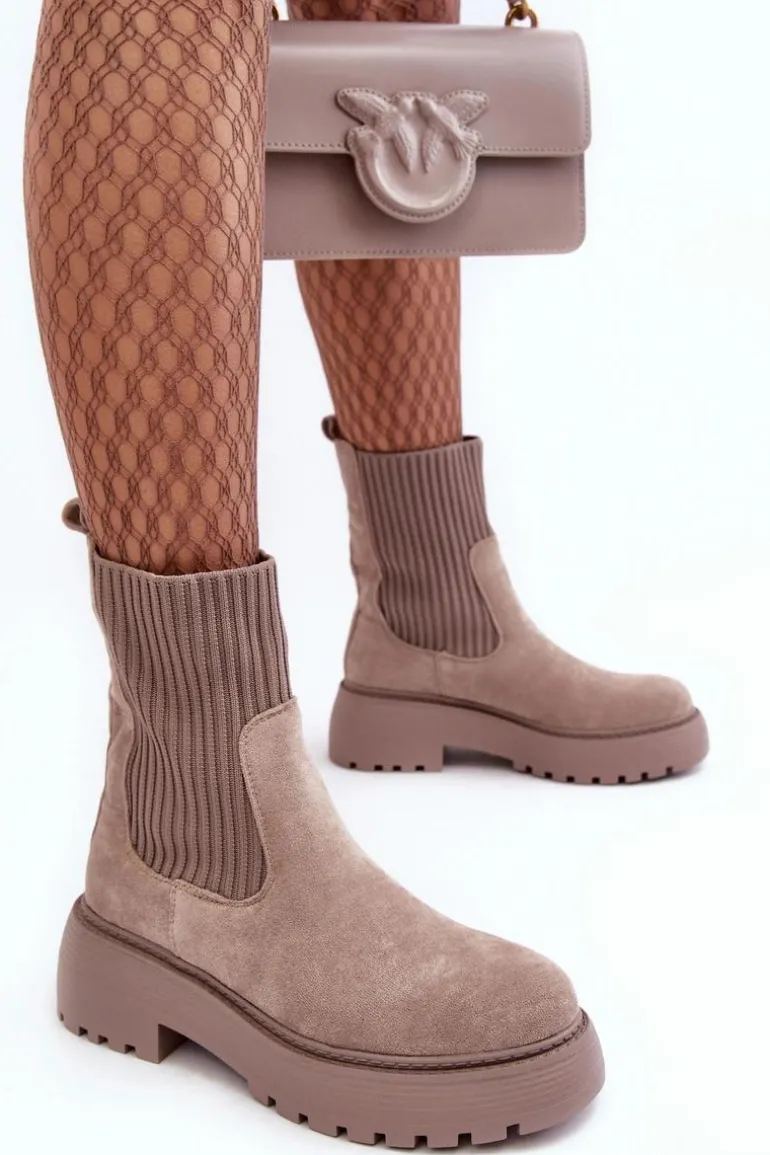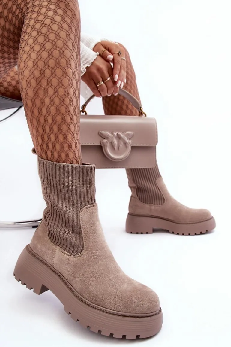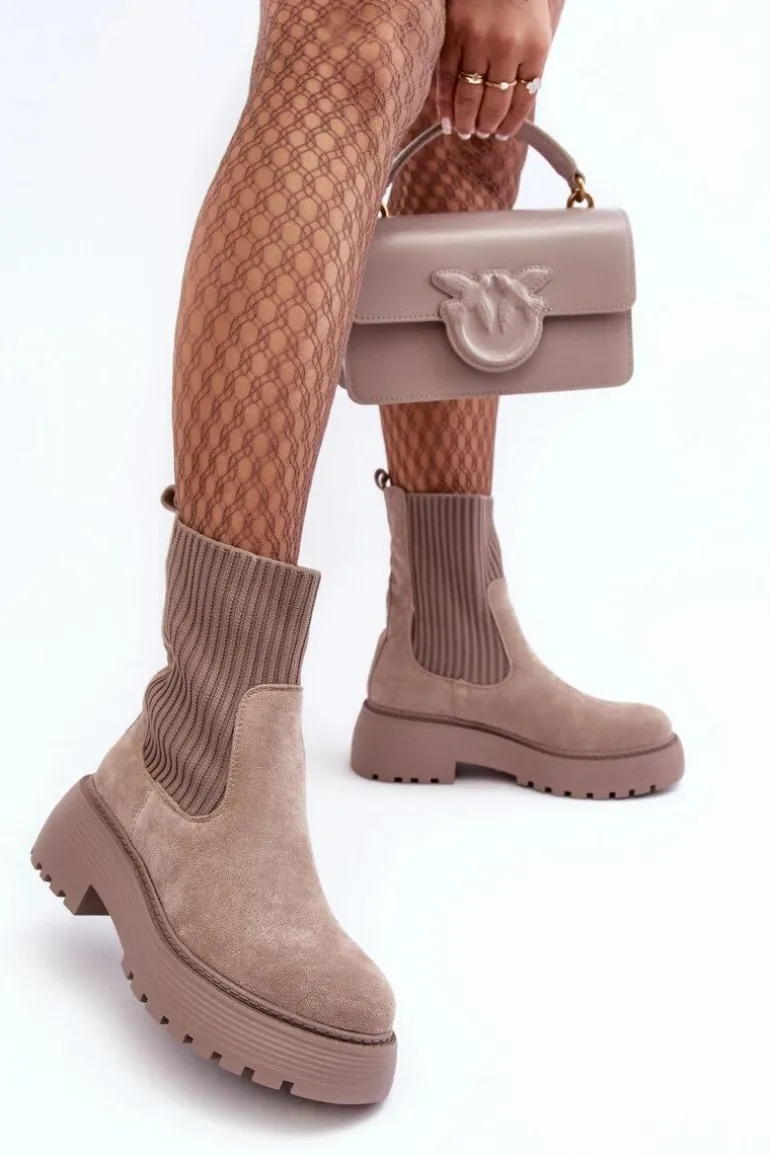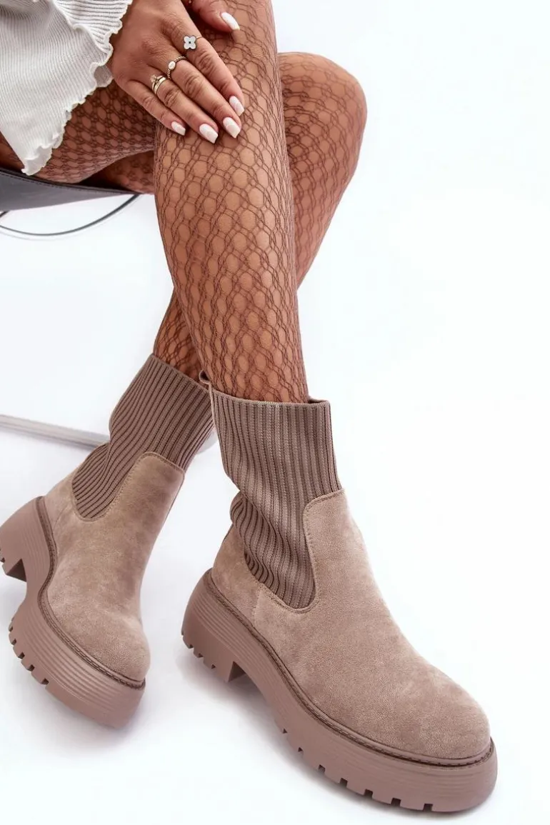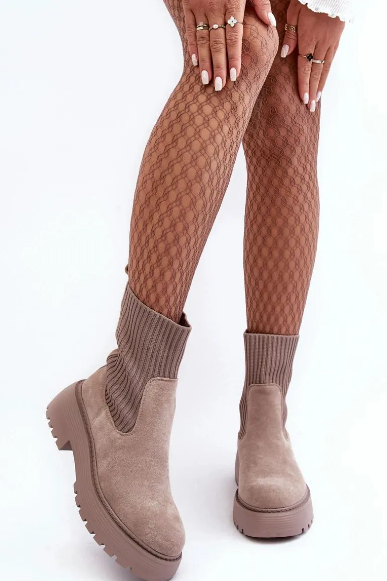 Zamszowe Botki Ze Skarpetą Na Platformie I Płaskim Obcasie Ciemnobeżowe Rewam