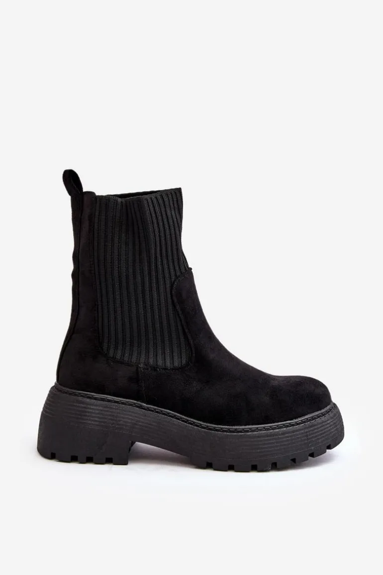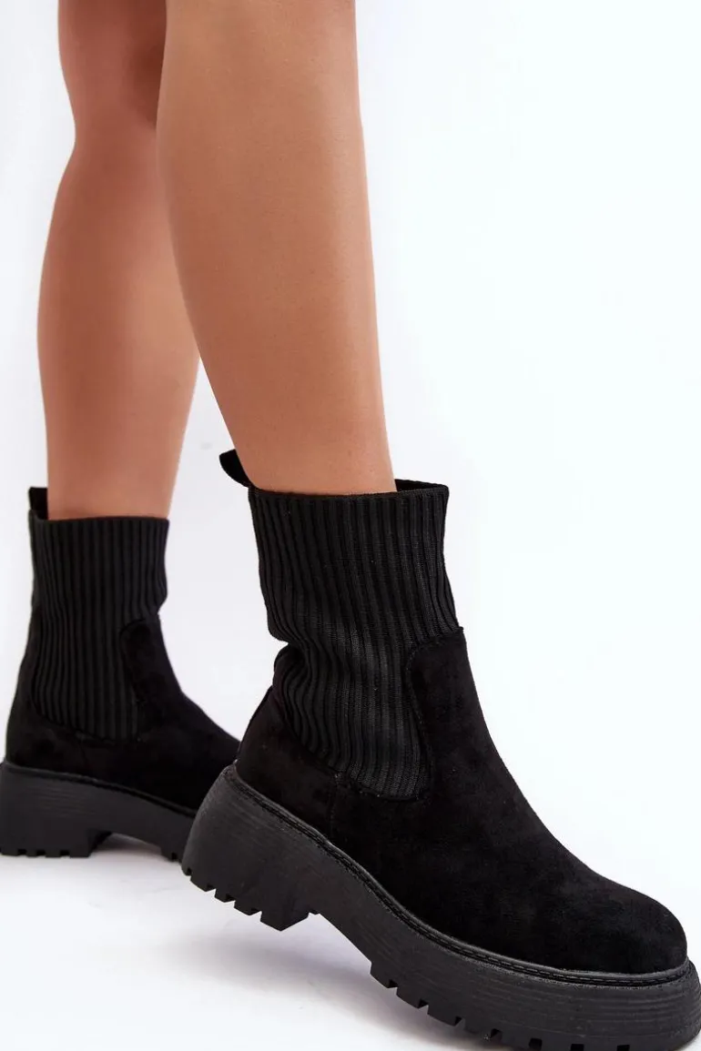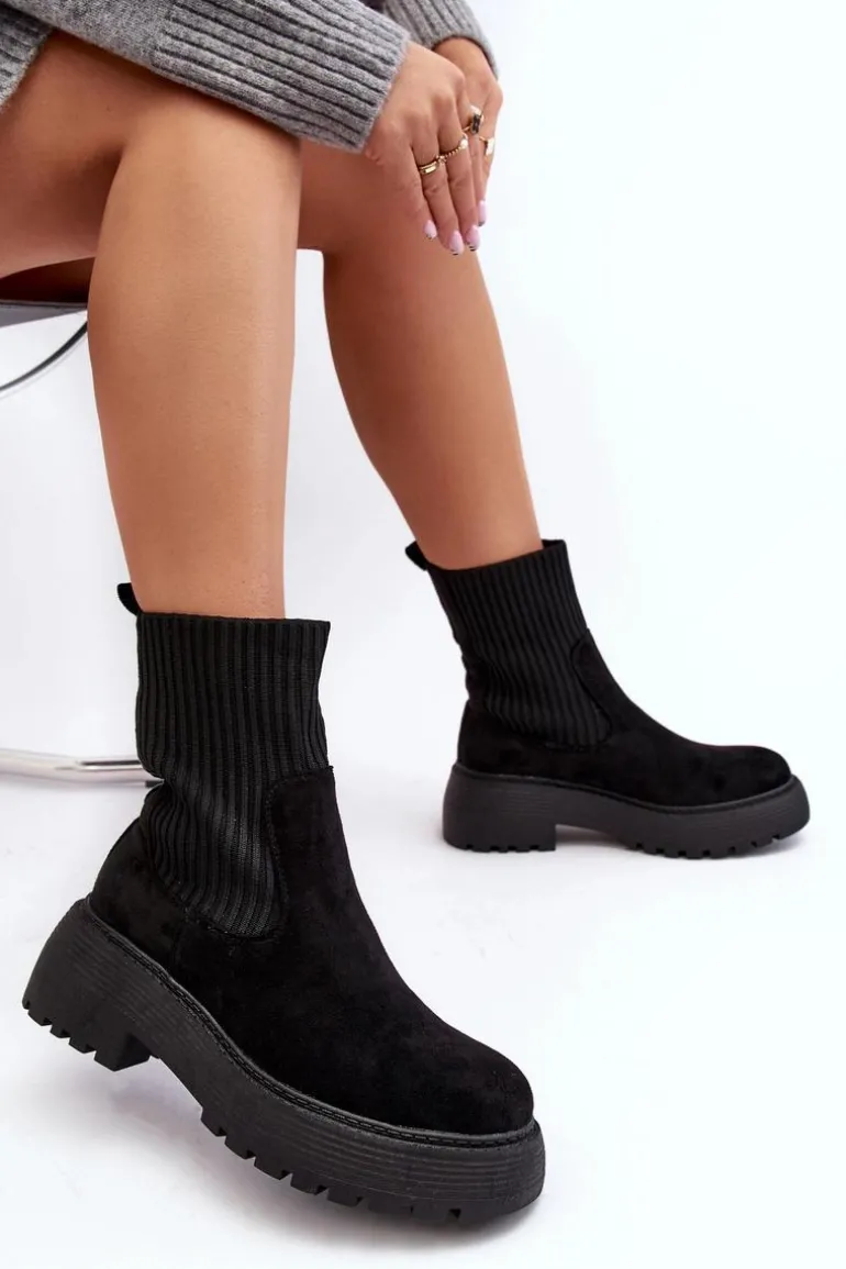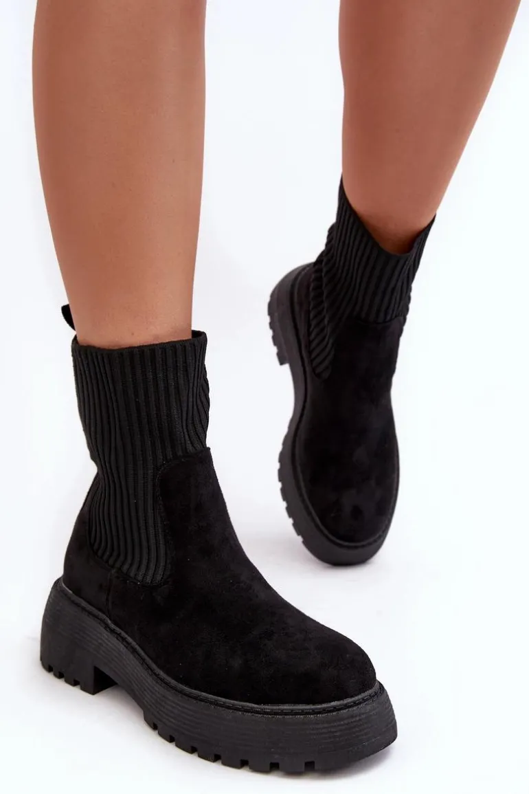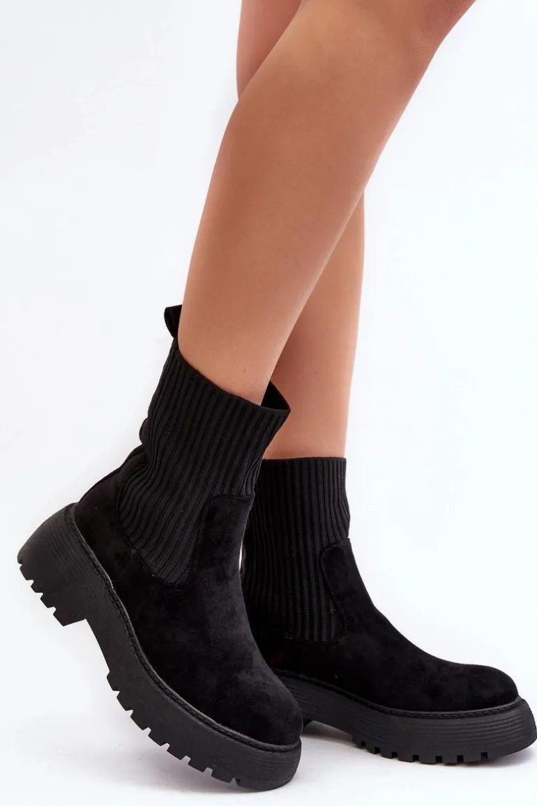 Botki damskie wykonane z połączenia eko zamszu i tkaniny. Osadzone na płaskim obcasie i platformie. Cholewka w formie skarpety. Model wsuwany. Noski zaokrąglone. Środek częściowo ocieplony. Nie czekaj aż znikną i kup już dziś! Przy wyborze rozmiaru prosimy sugerować się tabelą rozmiarów.