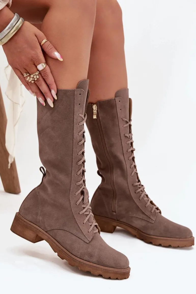 Damskie botki z naturalnego zamszu to doskonała propozycja na każdą okazję. Sięgające do połowy łydki, idealnie eksponują nogę, dodając jej smukłości. Cała długość cholewki została ozdobiona sznurowaniem, które nie tylko przyciąga wzrok, ale również pozwala na idealne dopasowanie do nogi. Dodatkowo botki zapinane są na zamek, co ułatwia ich zakładanie i zdejmowanie. Te botki stanowią świetny wybór do codziennych, jak i bardziej eleganckich stylizacji. Przy wyborze rozmiaru prosimy sugerować się poniższą tabelą rozmiarów.