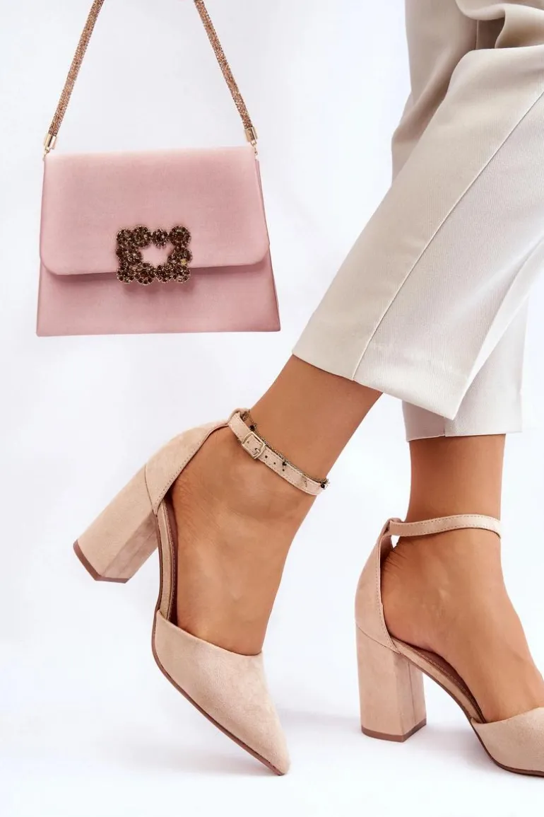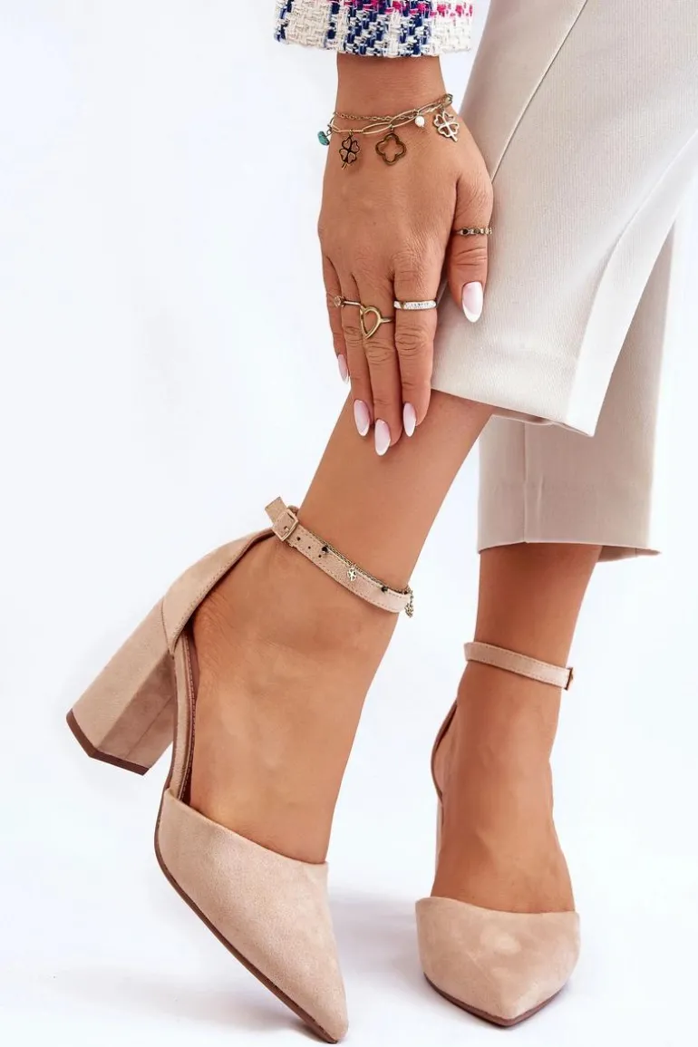 Klasyczne czółenka z noskiem w szpic zostały wykonane z eko zamszu. Zapinane wokół kostki na sprzączkę z regulowanym paskiem. Miękka wkładka z eko skóry zapewnia wysoki komfort użytkowania. Czółenka zostały osadzone na obcasie w postaci słupka. Świetnie sprawdzą się w zestawieniu z sukienkami, eleganckimi spodniami czy jeansami. Przy wyborze rozmiaru prosimy kierować się tabelą rozmiarów