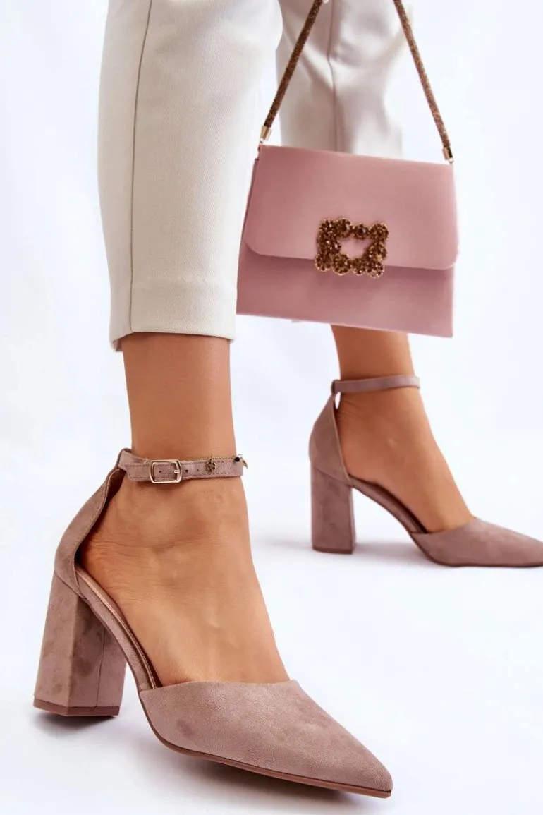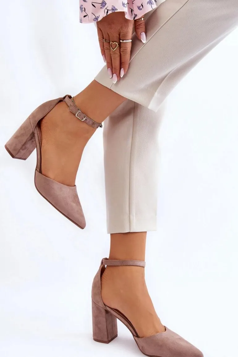 Klasyczne czółenka z noskiem w szpic zostały wykonane z eko zamszu. Zapinane wokół kostki na sprzączkę z regulowanym paskiem. Miękka wkładka z eko skóry zapewnia wysoki komfort użytkowania. Czółenka zostały osadzone na obcasie w postaci słupka. Świetnie sprawdzą się w zestawieniu z sukienkami, eleganckimi spodniami czy jeansami. Przy wyborze rozmiaru prosimy kierować się tabelą rozmiarów