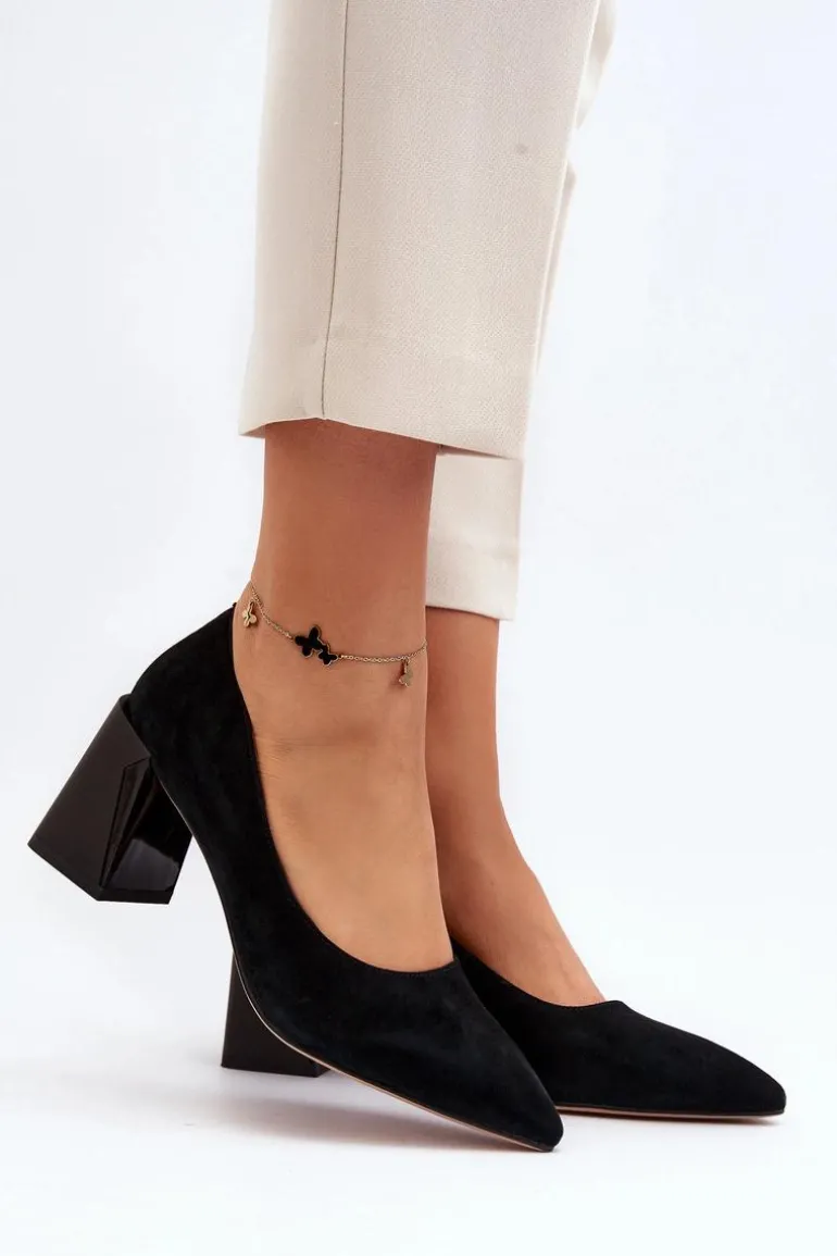 Eleganckie czółenka osadzone na obcasie słupku. Wykonane z najwyższej jakości materiałów, gwarantują nie tylko wyjątkowy wygląd, ale także niezrównany komfort noszenia. Ich miękka i wygodna wkładka ze skóry naturalnej sprawia, że nawet długotrwałe użytkowanie nie będzie stanowiło problemu. Noski w szpic optycznie wysmuklają nogi, dodając stylu każdej stylizacji. Ten elegancki fason z pewnością dopełni wiele różnorodnych outfitów, dodając im elegancji i klasy. Przy wyborze rozmiaru prosimy sugerować się tabelą rozmiarów.