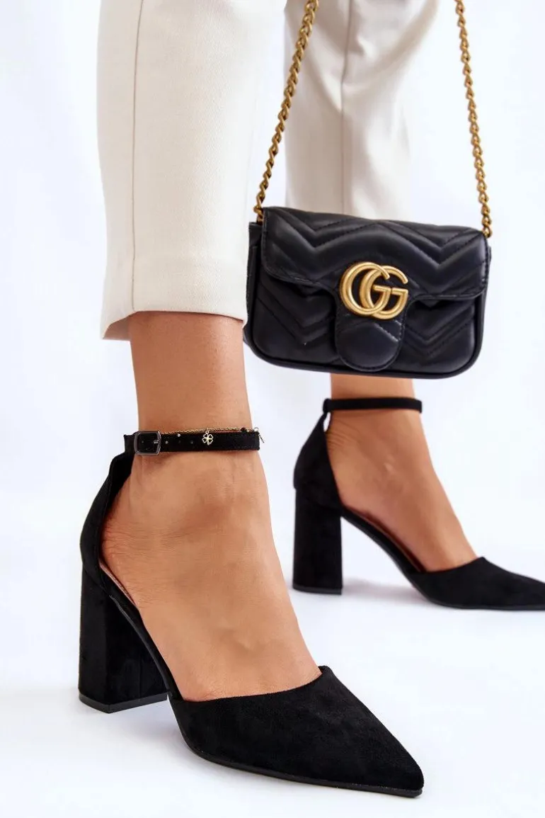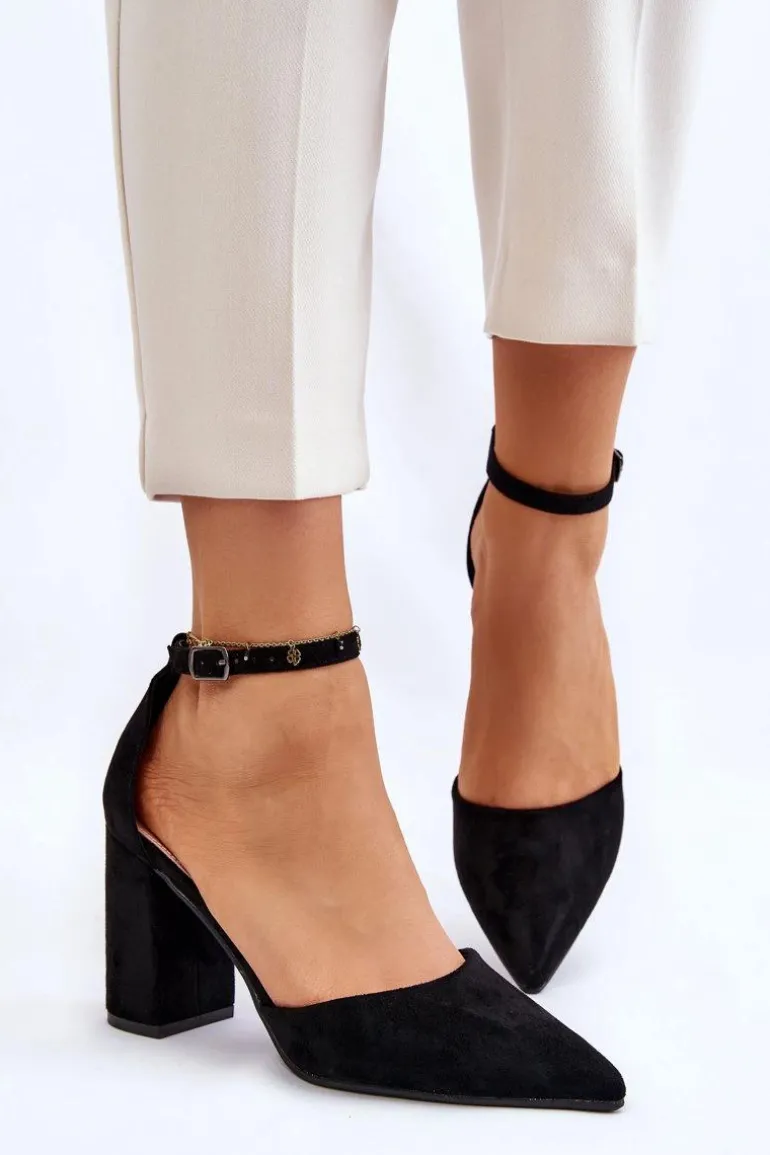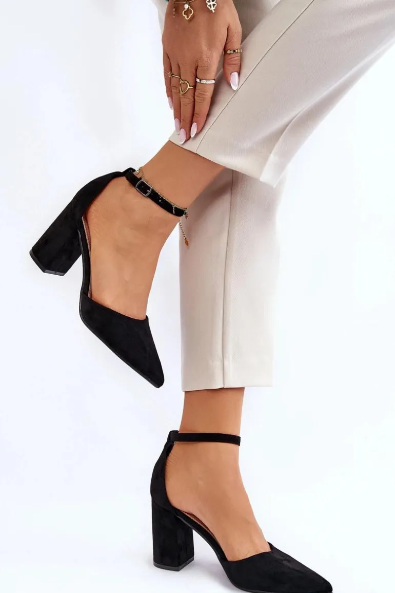 Klasyczne czółenka z noskiem w szpic zostały wykonane z eko zamszu. Zapinane wokół kostki na sprzączkę z regulowanym paskiem. Miękka wkładka z eko skóry zapewnia wysoki komfort użytkowania. Czółenka zostały osadzone na obcasie w postaci słupka. Świetnie sprawdzą się w zestawieniu z sukienkami, eleganckimi spodniami czy jeansami. Przy wyborze rozmiaru prosimy kierować się tabelą rozmiarów