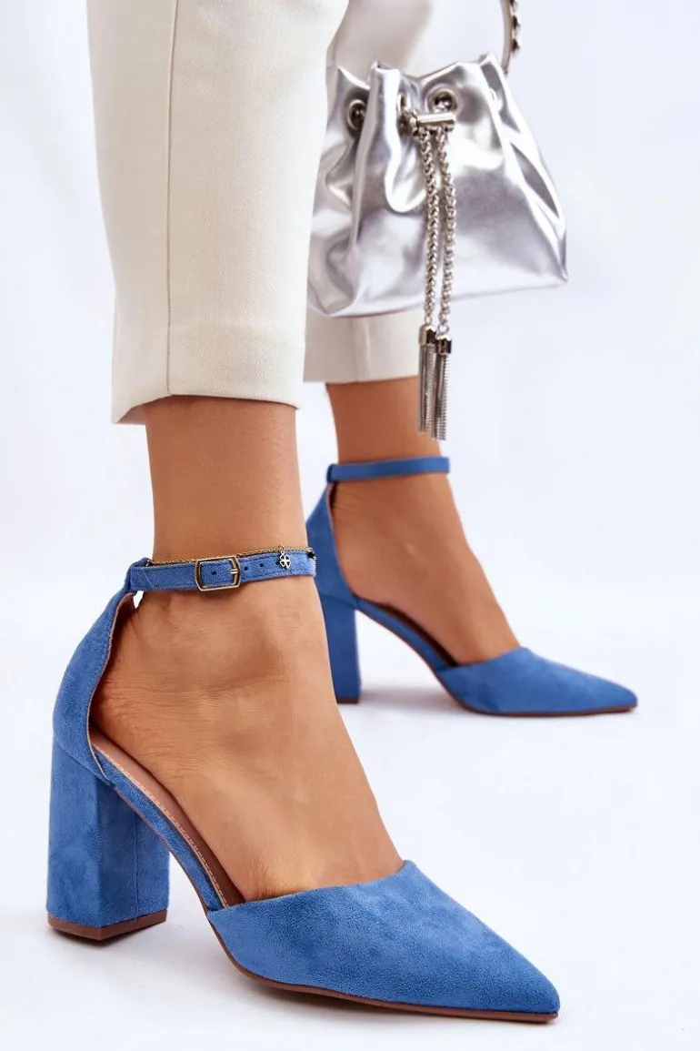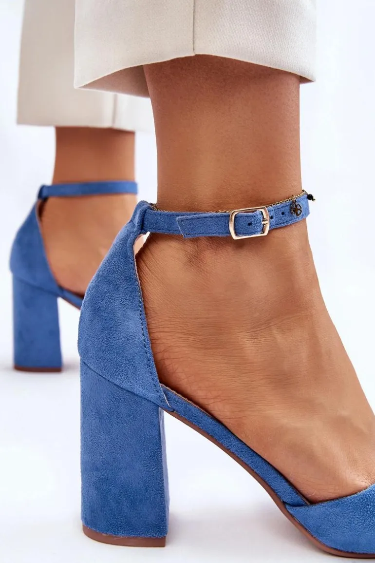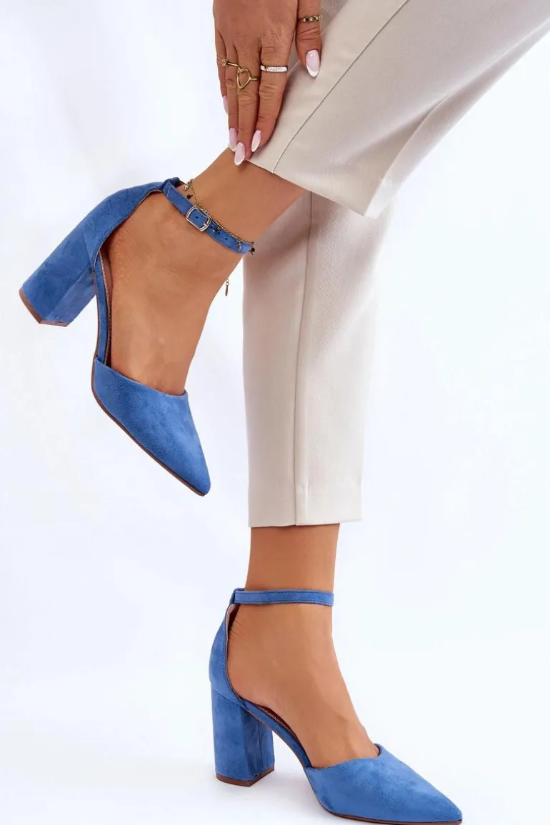 Klasyczne czółenka z noskiem w szpic zostały wykonane z eko zamszu. Zapinane wokół kostki na sprzączkę z regulowanym paskiem. Miękka wkładka z eko skóry zapewnia wysoki komfort użytkowania. Czółenka zostały osadzone na obcasie w postaci słupka. Świetnie sprawdzą się w zestawieniu z sukienkami, eleganckimi spodniami czy jeansami. Przy wyborze rozmiaru prosimy kierować się tabelą rozmiarów