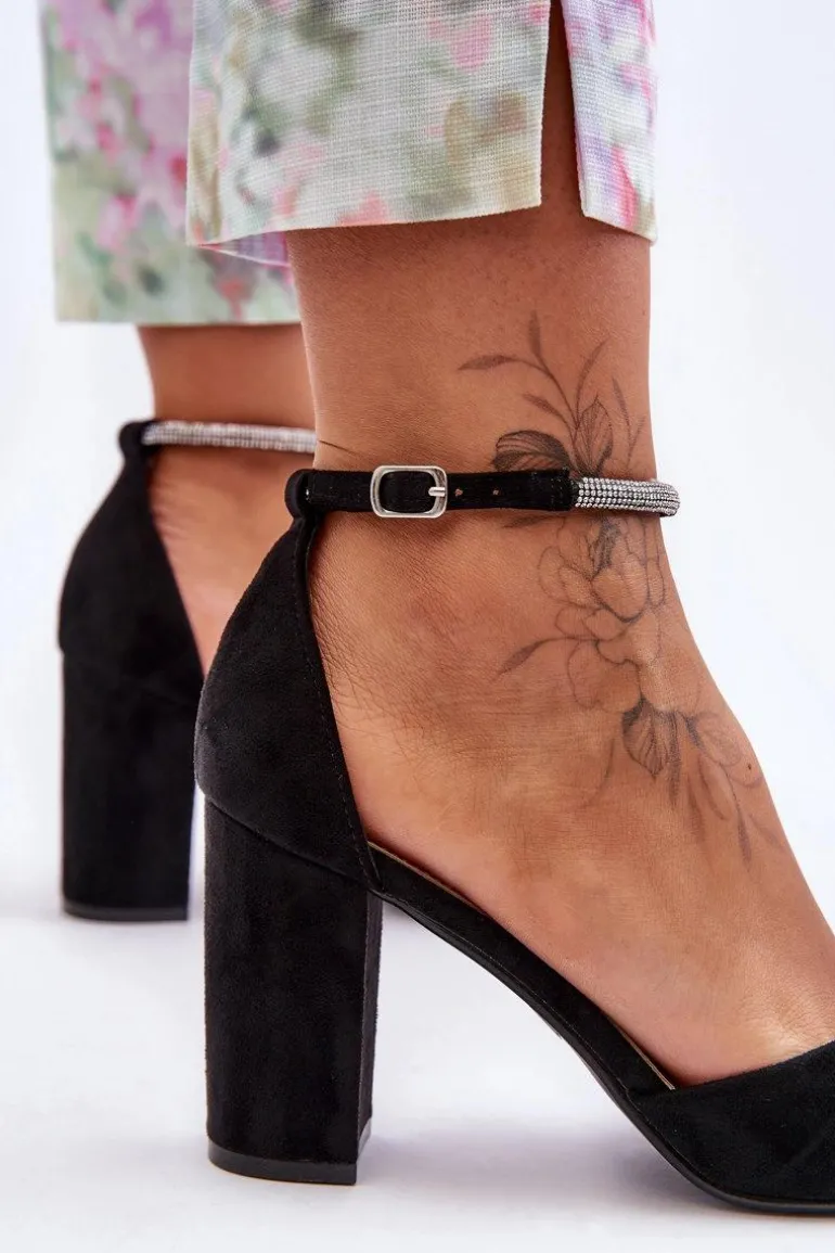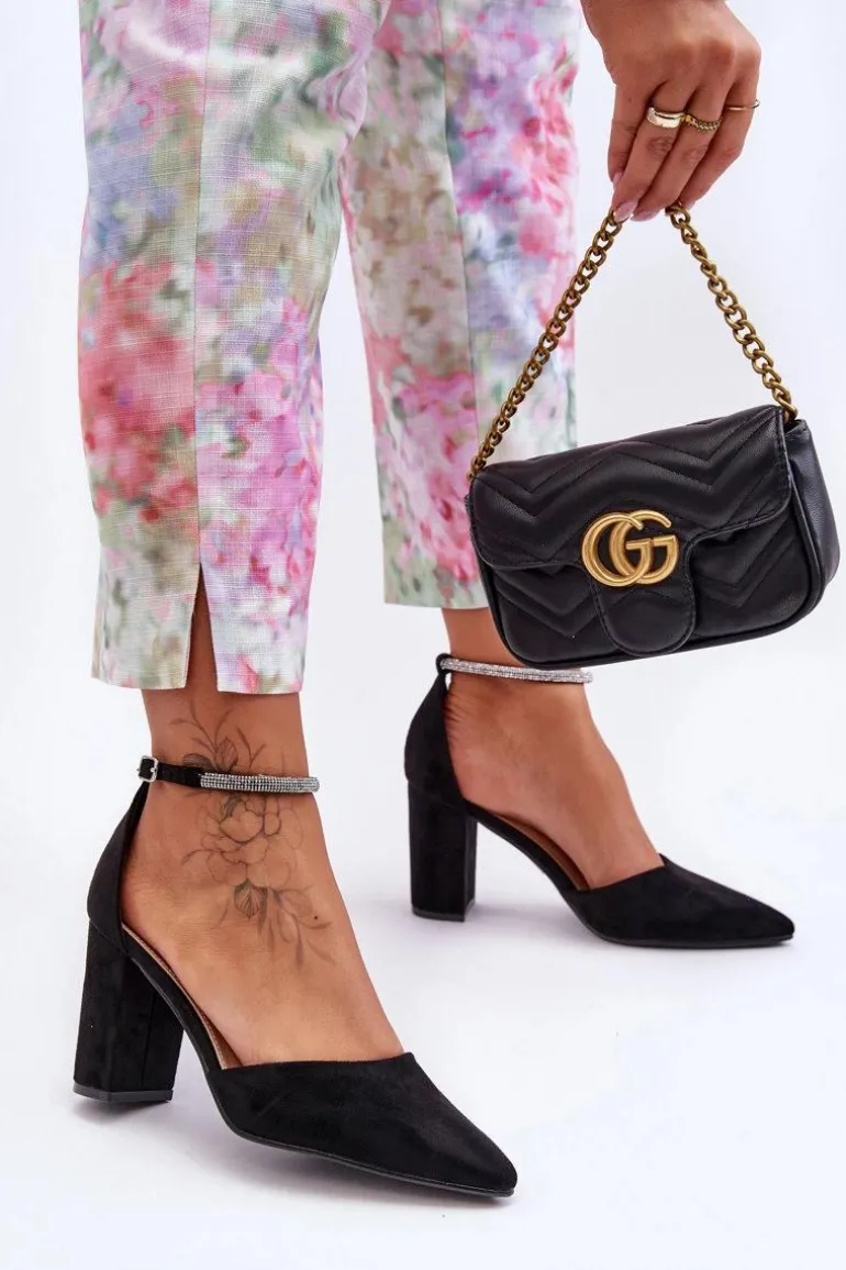 Klasyczne czółenka z noskiem w szpic zostały wykonane z eko zamszu. Zapinane wokół kostki na sprzączkę z regulowanym paskiem ozdobionym dżetami imitującymi cyrkonie. Miękka wkładka z eko skóry zapewnia wysoki komfort użytkowania. Czółenka zostały osadzone na obcasie w postaci stabilnego słupka. Świetnie sprawdzą się w zestawieniu z sukienkami, eleganckimi spodniami czy jeansami. Przy wyborze rozmiaru prosimy kierować się tabelą rozmiarów