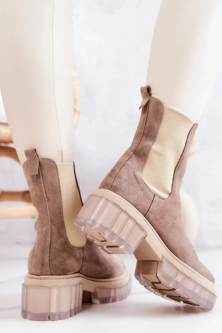 Botki na masywnej platformie z szerokim obcasem w stylu sztybletów. Posiadają wysoką, sięgającą ponad kostkę cholewkę. Wykonane z naturalnej zamszowej skóry. Posiadają dodatkową, elastyczną wstawkę, dzięki której cholewka świetnie dopasuje się do tęgości nogi. Boki podeszwy są ozdobione przezroczystym, gumowym tworzywem. Przy wyborze rozmiaru prosimy kierować się tabelą rozmiarów