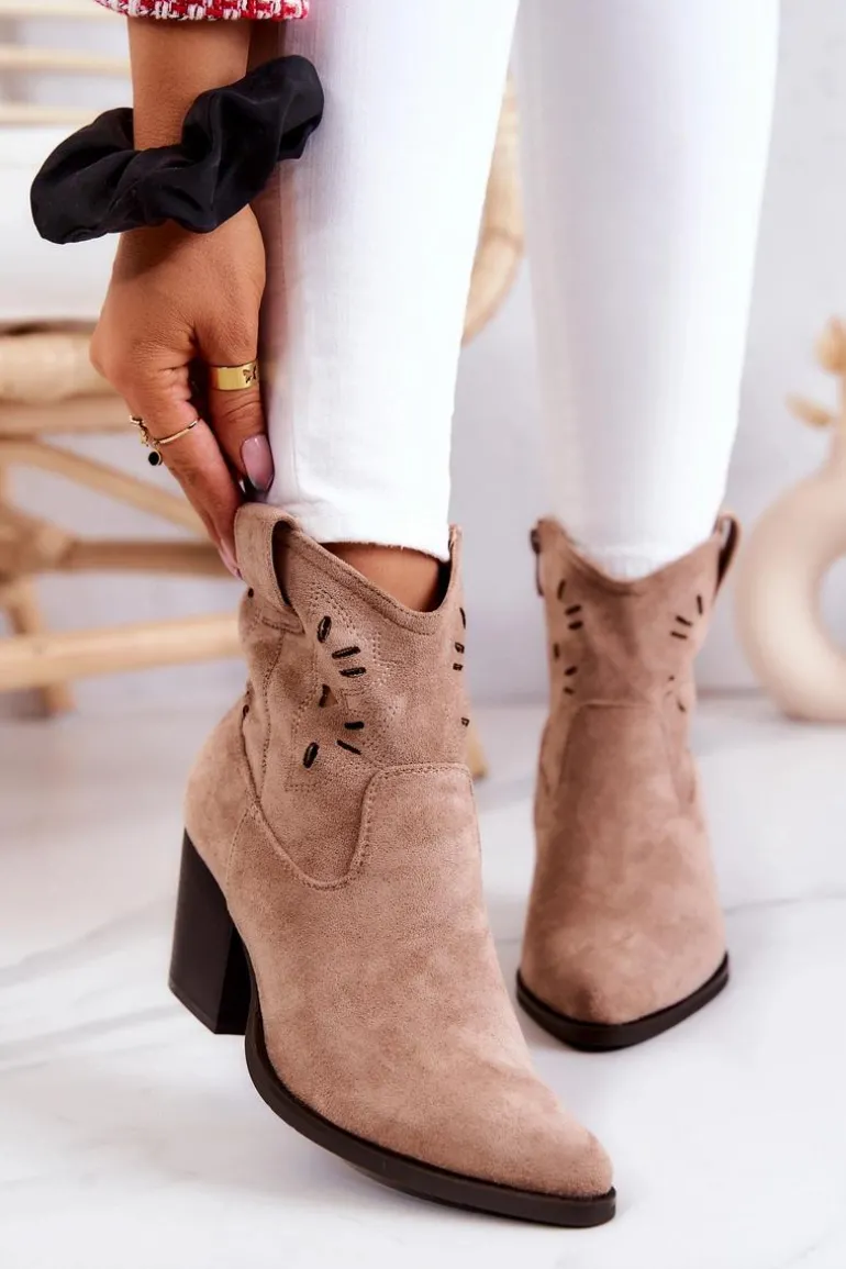 Kowbojki na masywnym słupku posiadają u góry zaokrągloną cholewką i nosek w szpic. Zapinane na zamek błyskawiczny. Usztywniany zapiętek. Wykonane z eko zamszu. Botki typu kowbojki będą świetnym uzupełnieniem wielu stylizacji. Możesz nosić je w wielu stylizacjach m.in.: do szmizjerek, zwiewnych spódnic czy spodni jeansowych. Przy wyborze rozmiaru prosimy sugerować się tabelą rozmiarów.