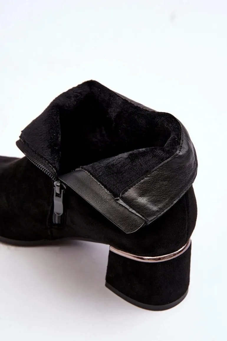 Damskie botki wykonane z eko zamszu. Osadzone na obcasie w postaci niskiego klocka. Noski w migdał. Cholewka za kostkę. Środek ocieplony kocem obuwniczym. Model ten zapinany jest na suwak z boku. Nad obcasem lustrzana, złota ozdoba. Przy wyborze rozmiaru prosimy sugerować się tabelą rozmiarów.