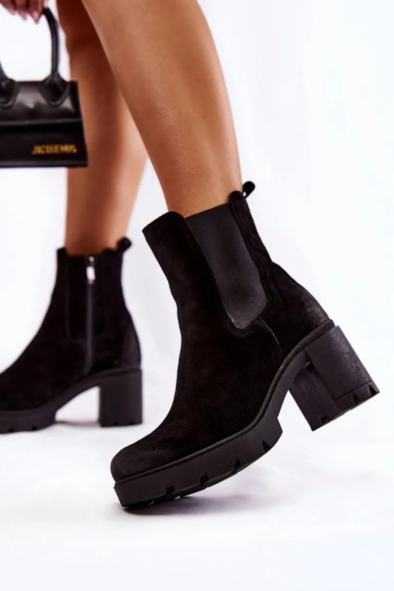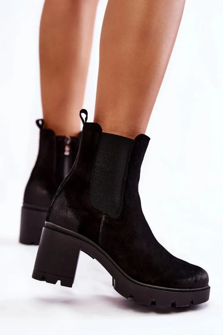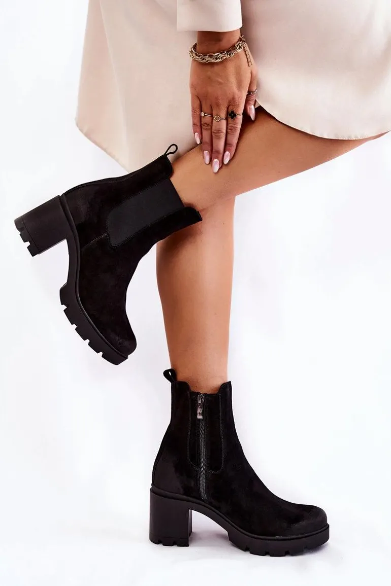 Botki na masywnej platformie z szerokim obcasem w stylu sztybletów. Posiadają wysoką, sięgającą ponad kostkę cholewkę. Wykonane ze skóry naturalnej. Posiadają dodatkową, elastyczną wstawkę, dzięki której cholewka świetnie dopasuje się do tęgości nogi. Buty zostały ocieplone kocem obuwniczym. Botki doskonale sprawdzą się w jesiennych stylizacjach. Przy wyborze rozmiaru prosimy kierować się tabelą rozmiarów