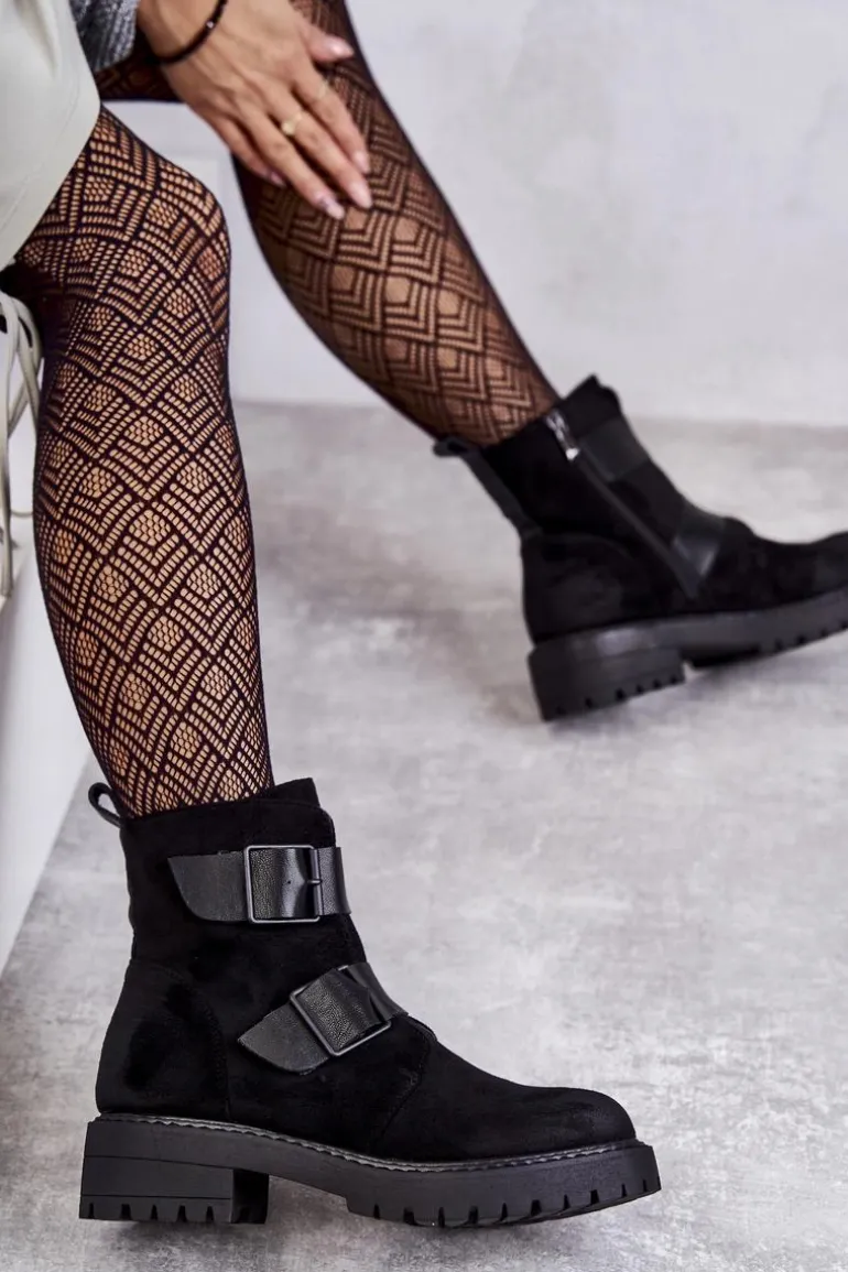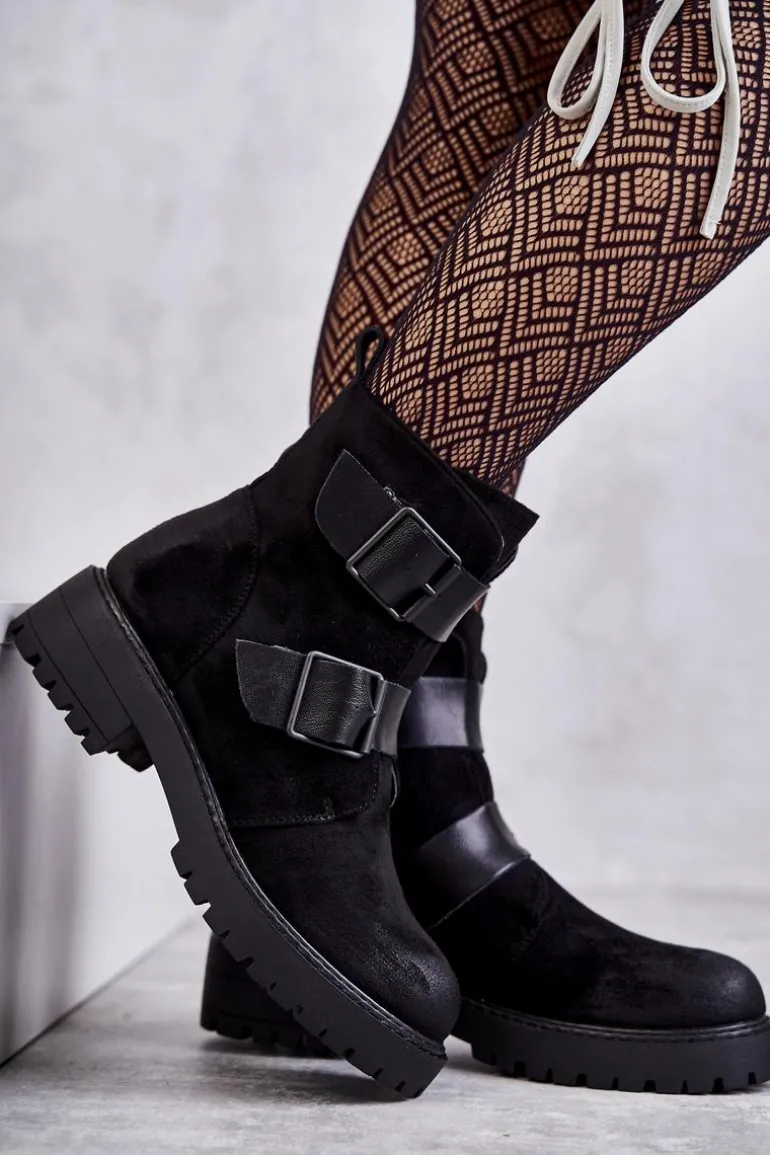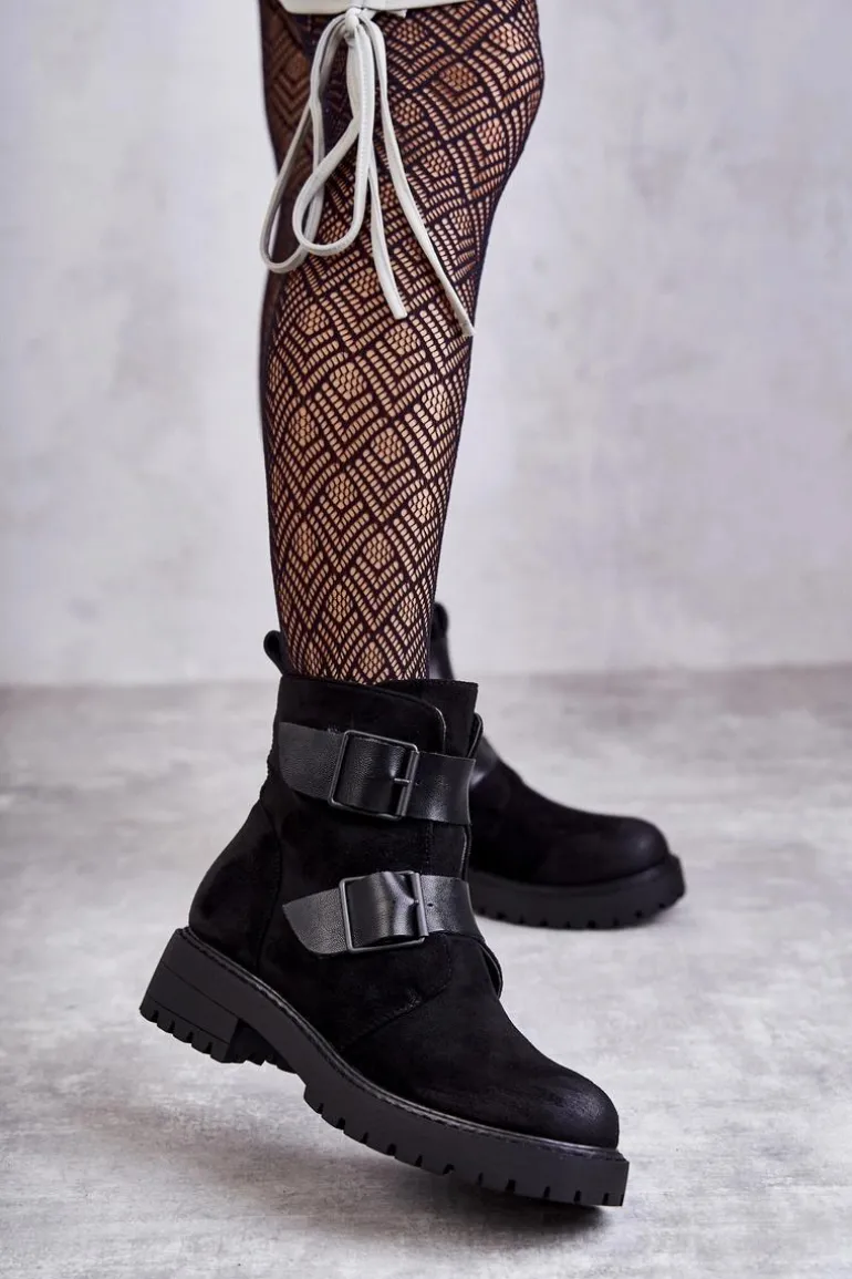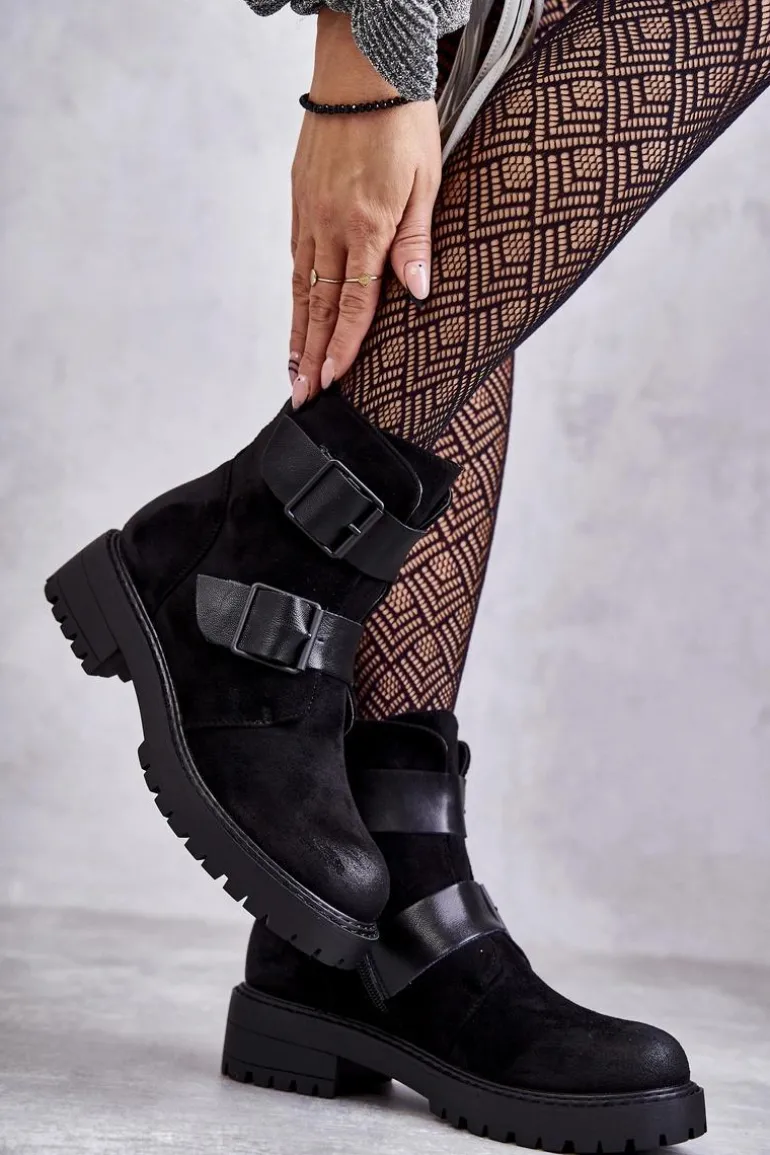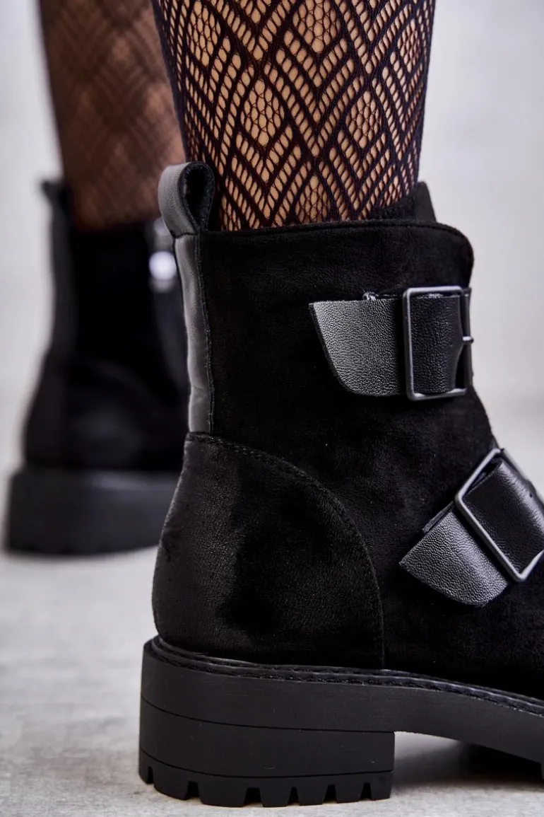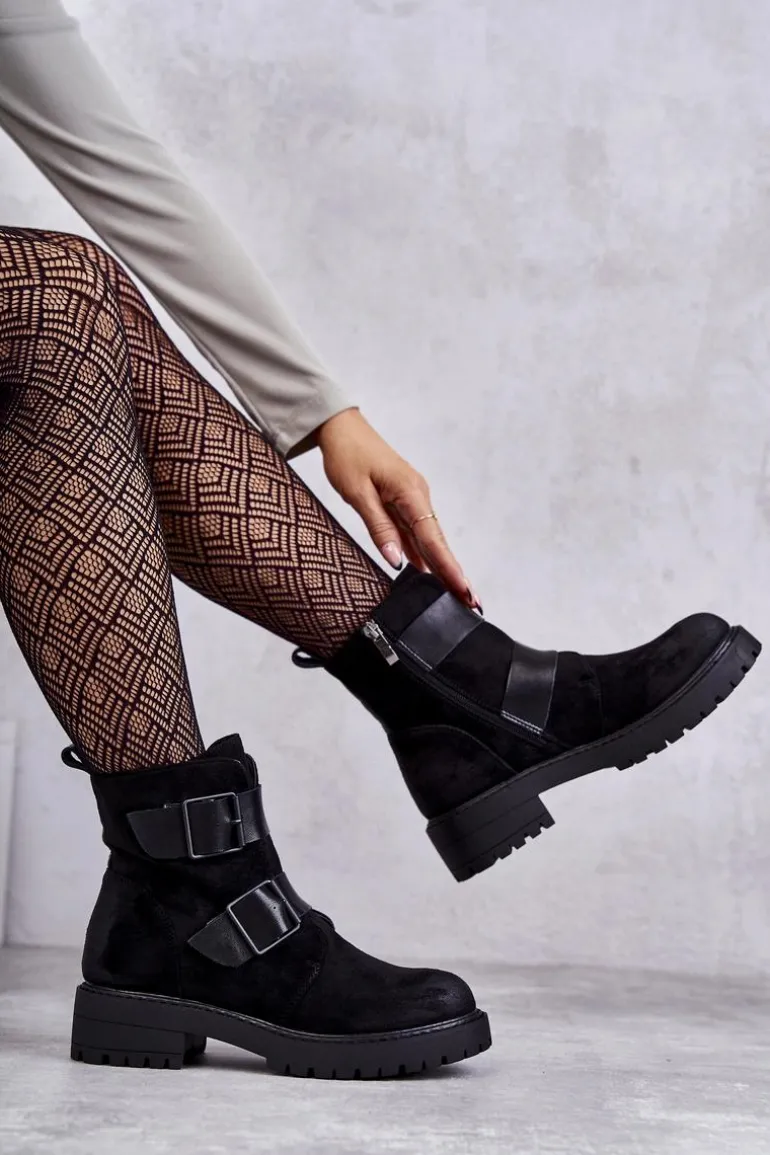 Klasyczne botki damskie zostały wykonane z eko skóry. Posiadają ozdobne paski z klamrami na boku cholewki. Model zapinany na suwak. Osadzone na płaskim obcasie oraz platformie wraz ze żłobieniem. Botki są ocieplane w środku kocem obuwniczym. Posiadają usztywniany zapiętek. Modne obuwie, które świetnie sprawdzi się do pracy, szkoły. Przy wyborze rozmiaru prosimy sugerować się tabelą rozmiarów.