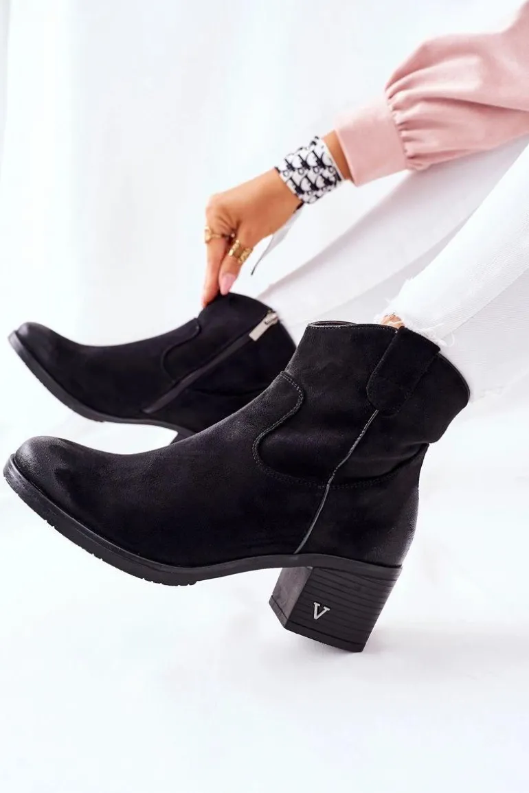 Cholewka wykonana jest z zamszowej skóry ekologicznej. Wnętrze botków pokryte zostało ciepłym kocem obuwniczym, który zagwarantuje ciepło. Zakładanie ułatwi wszyty z tyłu suwak. Przy wyborze rozmiaru prosimy sugerować się tabelą rozmiarów.
