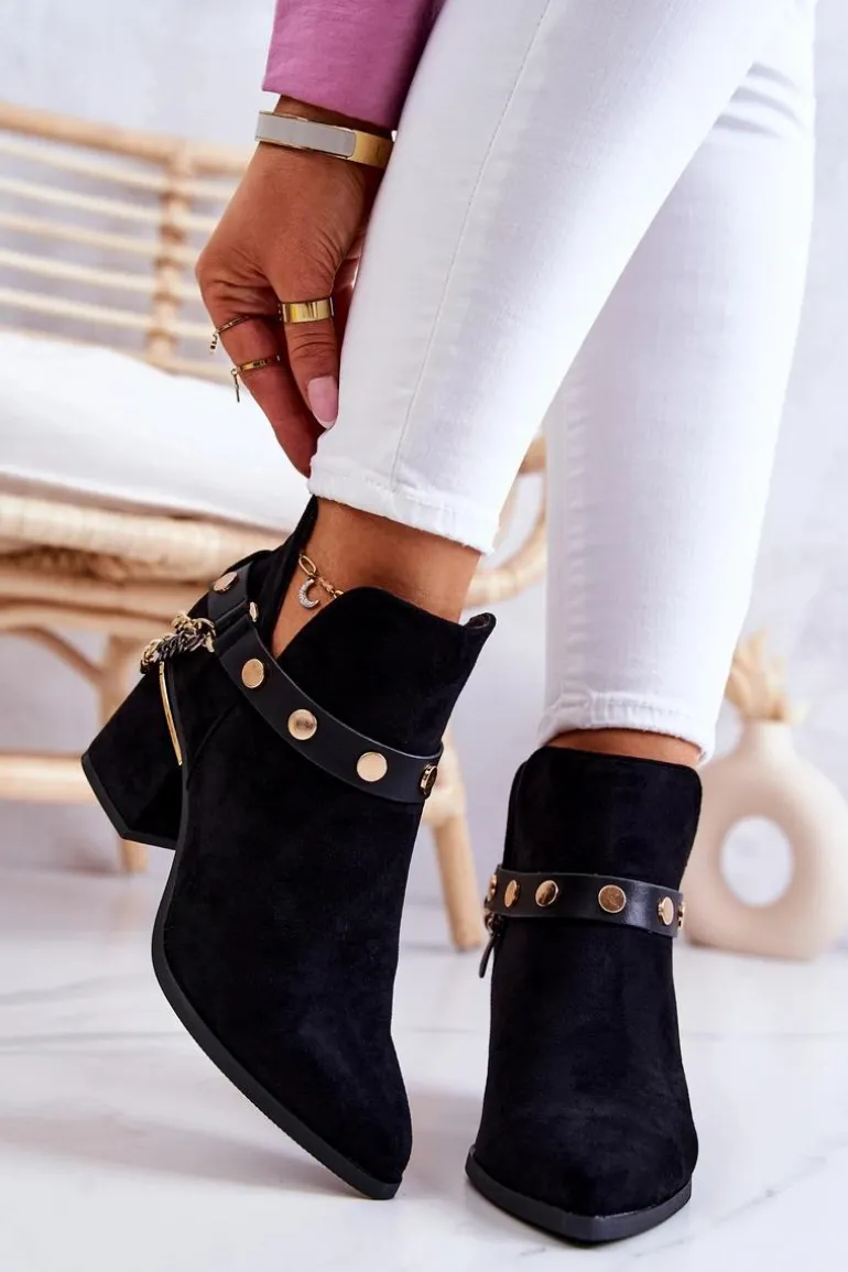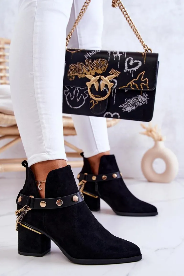 Cudowne botki, które idealnie sprawdzą się w sezonie wiosenno-jesiennym. Wykonane z delikatnego eko zamszu. Posiadają krótki suwak z wewnętrznej strony. Ozdobny pasek z łańcuszkami jest zapinany na napę i można go w każdej chwili odpiąć. Dwa modele w jednym! Fason kowbojek świetnie będzie komponował się z wieloma stylizacjami. Stabilny obcas w postaci szerokiego słupka delikatnie uniesie Twoją sylwetkę. Przy wyborze rozmiaru prosimy sugerować się tabelą rozmiarów.