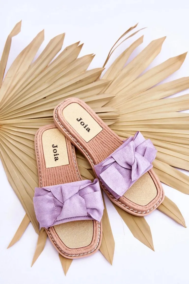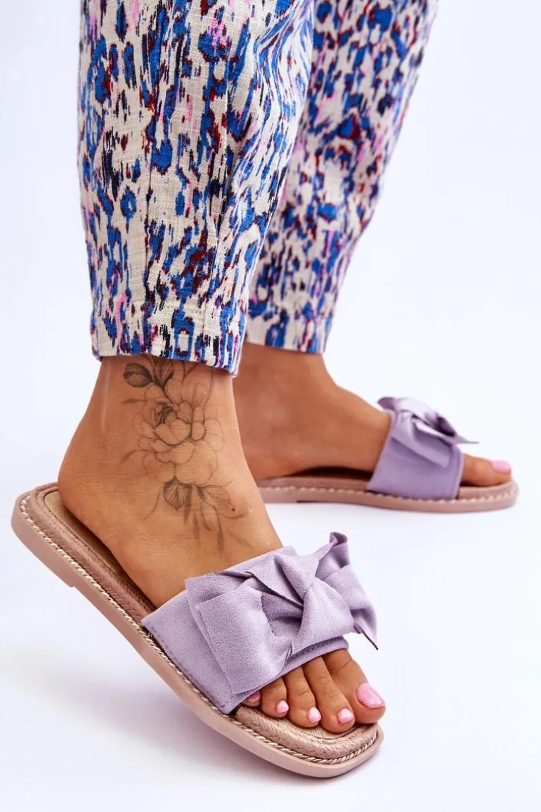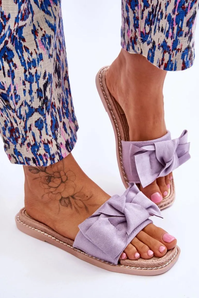 Klasyczne, wsuwane klapki damskie zostały wykonane z wierzchu z eko zamszu. Dodatkowo z przodu posiadają kokardę. Wkładka oraz podeszwa zostały wykonane z gumowego tworzywa. Klapki są wygodne w użytkowaniu oraz elastyczne. Podeszwa jest także antypoślizgowa. Wokół podeszwy znajduje się ozdobny sznurek. Klapki osadzono na płaskim obcasie. Przy wyborze rozmiaru prosimy sugerować się tabelą rozmiarów.