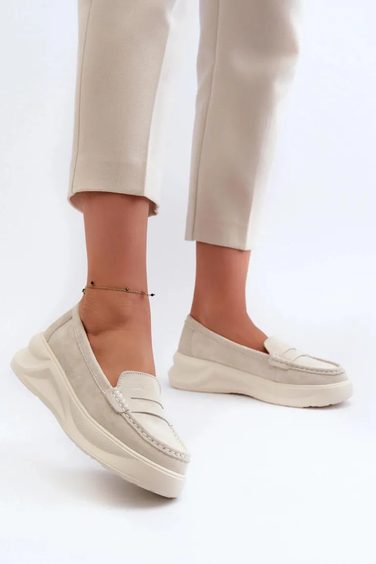 Mokasyny damskie wykonane z naturalnego zamszu. Osadzone na platformie i lekkim koturnie. Noski zaokrąglone. Idealne do wielu stylizacji, te mokasyny to połączenie elegancji i komfortu. Koniecznie powinnaś je mieć w swojej garderobie! Przy wyborze rozmiaru prosimy sugerować się tabelą rozmiarów.
