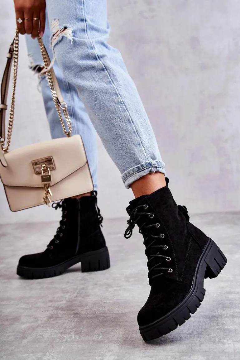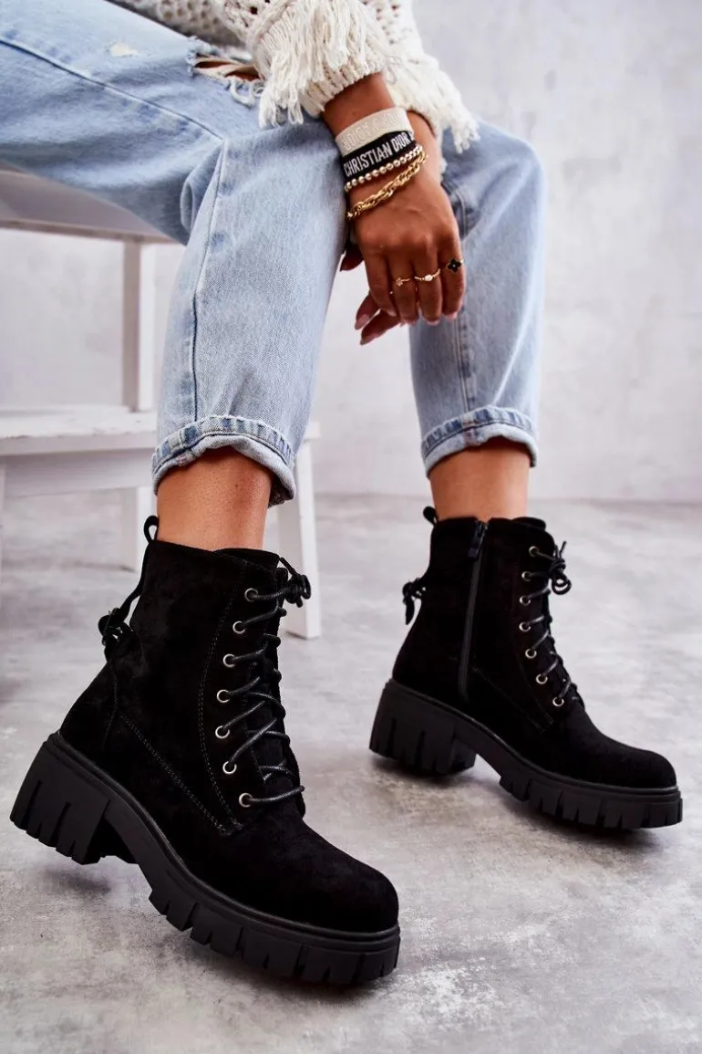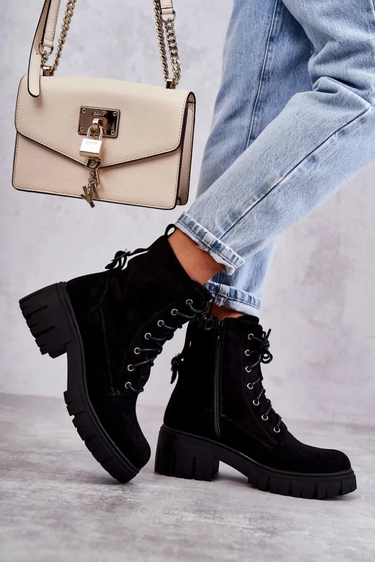 Damskie botki zostały wykonane z eko zamszu. Model ze sznurowaniem oraz suwakiem ułatwiającym zakładanie obuwia. Osadzone na płaskim obcasie i platformie. Botki posiadają w środku ocieplenie w postaci koca obuwniczego. Zapiętek usztywniany. Z tyłu cholewki znajduje się ozdobny pasek z klamrą. Przy wyborze rozmiaru prosimy sugerować się tabelą rozmiarów.