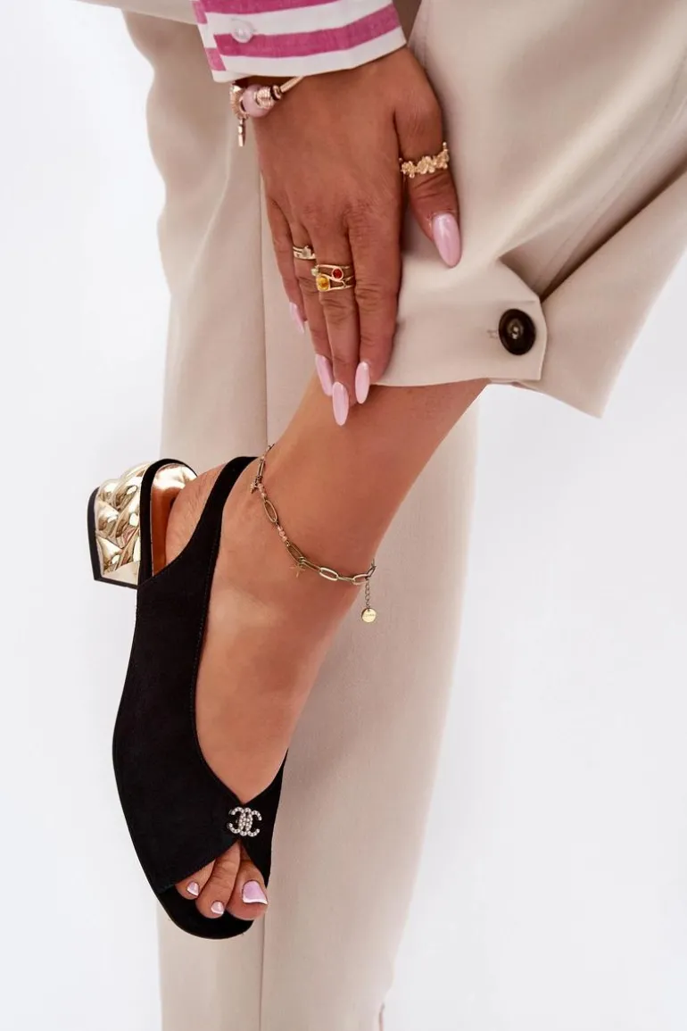 Sandały damskie od marki CheBello. Wykonane z wysokiej jakości naturalnego zamszu. Model ten wyróżnia się obcasem, który nadaje nowoczesnego charakteru. Z przodu znajduje się mały, ozdobny detal. Niezwykle elegancki fason, który doskonale dopełni stylizacje z sukienkami oraz spodniami. Doskonałe na różne uroczystości i wieczorne wyjścia. Przy wyborze rozmiaru prosimy sugerować się tabelą rozmiarów.
