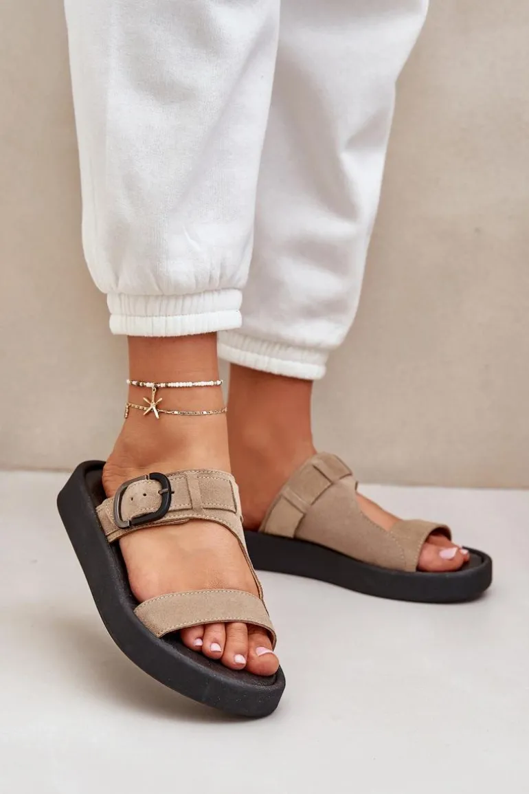Damskie klapki wykonane z naturalnego zamszu. Osadzone na platformie. Doskonałe na letnie dni, te klapki znakomicie uzupełnią każdą stylizację, łącząc modny wygląd z praktycznością. Pasek z klamrą zapewnia dodatkową regulację, a miękka wkładka skórzana gwarantuje komfort noszenia. Przy wyborze rozmiaru prosimy sugerować się tabelą rozmiarów.