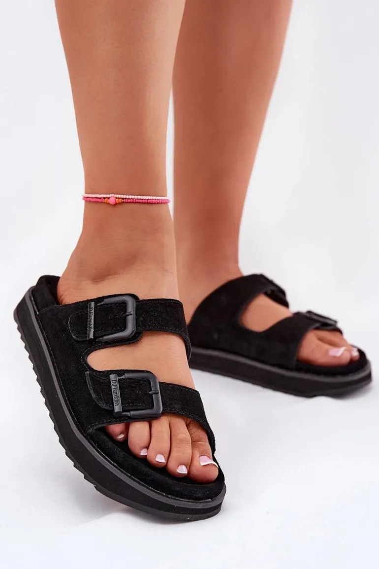 Klapki damskie od marki D.Franklin łączą styl i wygodę. Wykonane z zamszowych pasków, oferują miękkie i trwałe wykończenie, idealnie nadają się do codziennego użytku. Regulowane zapięcie na klamrę zapewnia indywidualne dopasowanie, zapewniając stabilność i wygodę przy każdym kroku. Ząbkowana podeszwa EVA zapewnia lekkość i doskonałą przyczepność, dzięki czemu są idealne na każdy teren. Logo D.Franklin, umieszczone na klamrze i pięcie, dodaje charakterystycznego i nowoczesnego akcentu. Przy wyborze rozmiaru prosimy sugerować się tabelą rozmiarów.