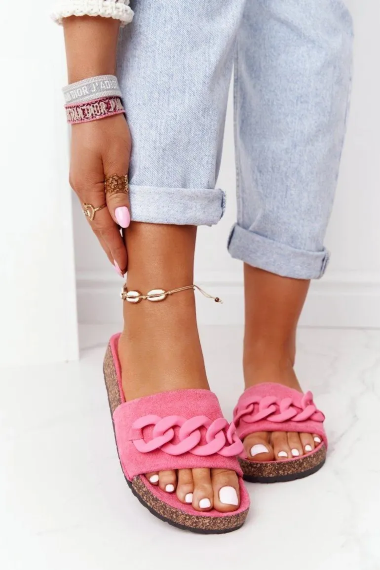 Wyjątkowe klapki damskie wykonane z eko zamszu. Buty posiadają profilowaną wkładkę, która zagwarantuje komfort. Modny fason ozdobiony lekkim łańcuchem urozmaici Twoje stylizacje! Przy wyborze rozmiaru prosimy sugerować się tabelą rozmiarów.