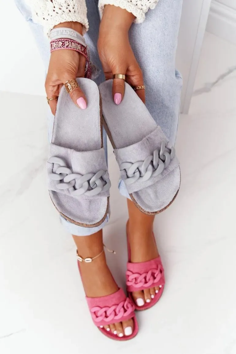 Wyjątkowe klapki damskie wykonane z eko zamszu. Buty posiadają profilowaną wkładkę, która zagwarantuje komfort. Modny fason ozdobiony lekkim łańcuchem urozmaici Twoje stylizacje! Przy wyborze rozmiaru prosimy sugerować się tabelą rozmiarów.