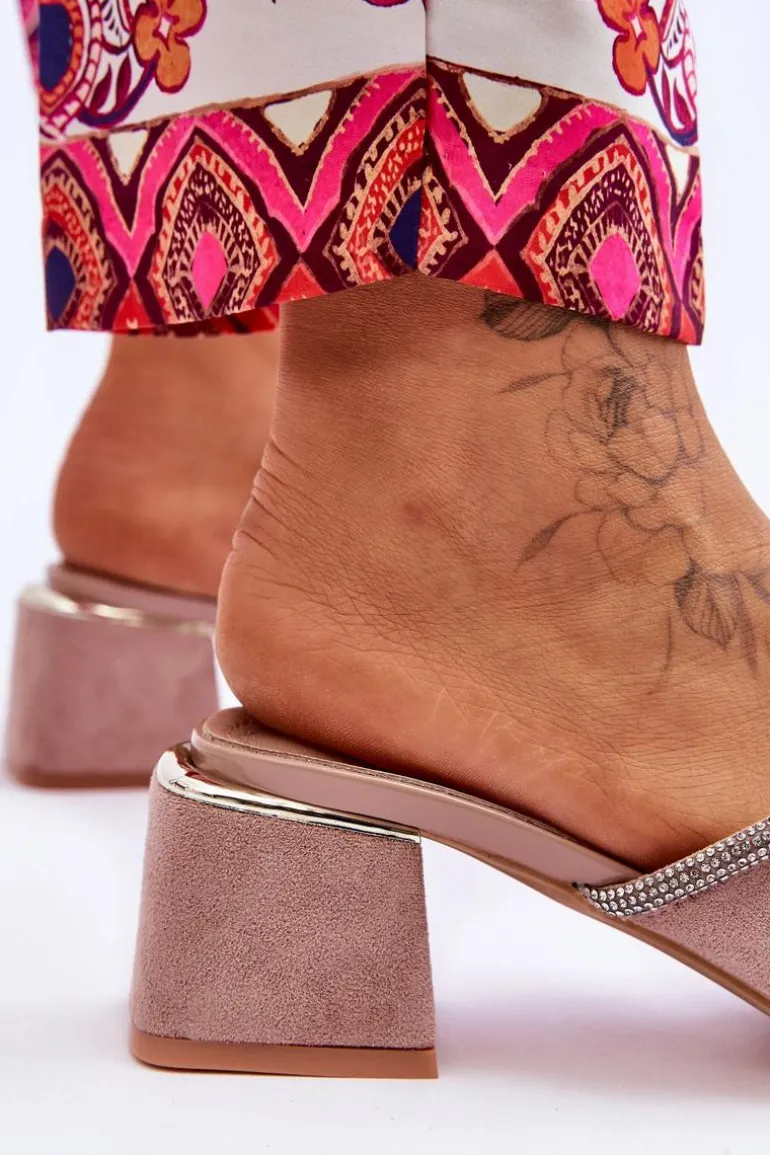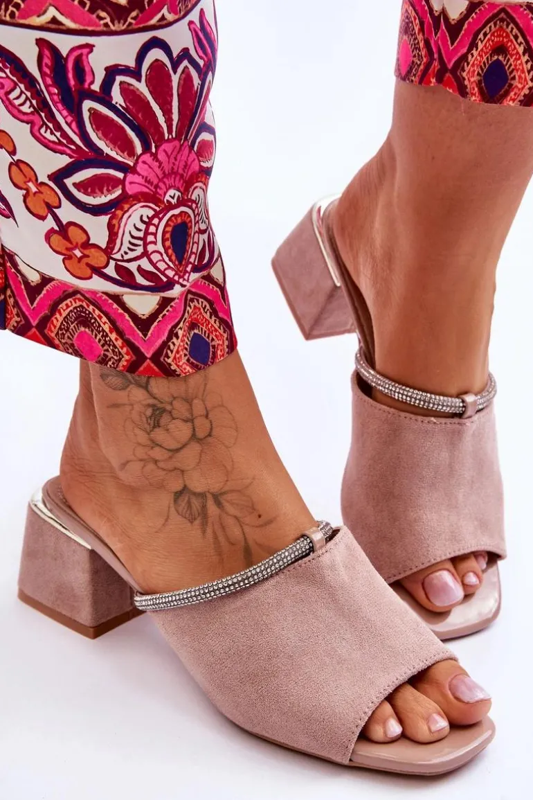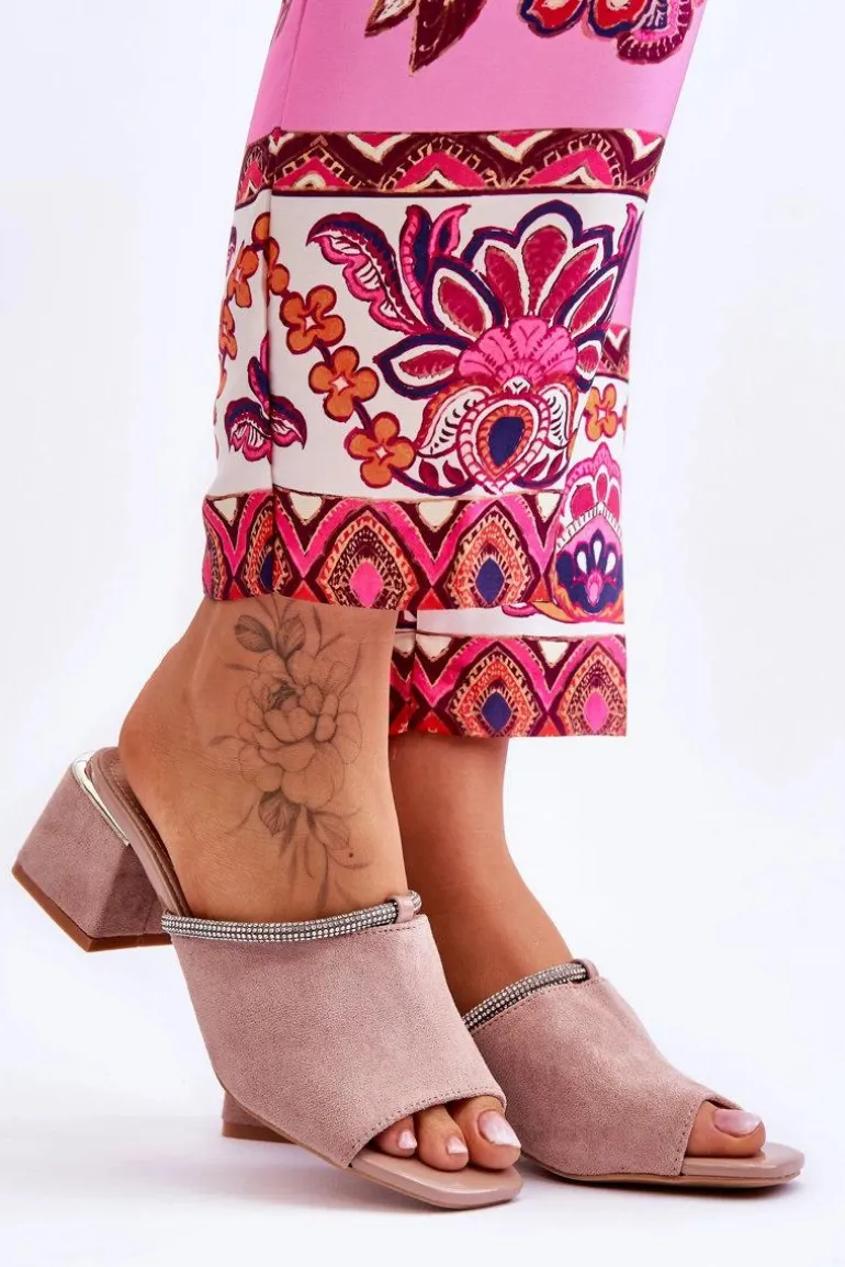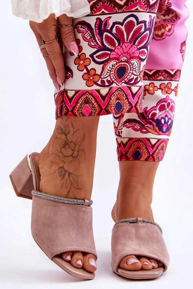 Niezwykle modne, damskie klapki z pewnością sprawdzą się w sezonie letnim w wielu sytuacjach! Zostały wykonane z miłego w dotyku eko zamszu. Klapki posiadają wykonaną z naturalnej skóry wkładkę. Dodatkowo zostały ozdobione paseczkiem z dżetami. Osadzone na obcasie w postaci klocka. Przy wyborze rozmiaru prosimy kierować się tabelą rozmiarów.