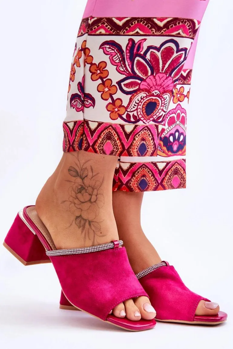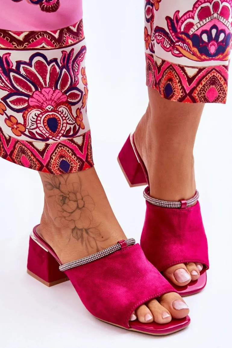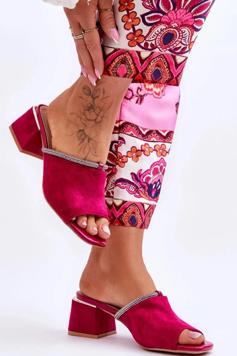 Niezwykle modne, damskie klapki z pewnością sprawdzą się w sezonie letnim w wielu sytuacjach! Zostały wykonane z miłego w dotyku eko zamszu. Klapki posiadają wykonaną z naturalnej skóry wkładkę. Dodatkowo zostały ozdobione paseczkiem z dżetami. Osadzone na obcasie w postaci klocka. Przy wyborze rozmiaru prosimy kierować się tabelą rozmiarów.