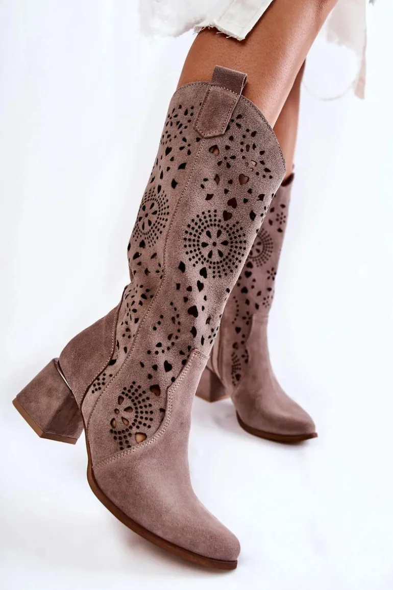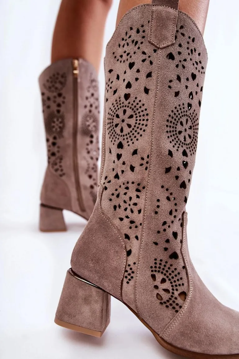 Kozaki z ażurową cholewką do kolana oraz noskiem w szpic. Zapinane na całości cholewki na zamek błyskawiczny. Posiadają usztywniany zapiętek. Wykonane ze skóry naturalnej. To kozaki, z którymi stworzysz wiele ciekawych stylizacji na co dzień. Miękka, skórzana wkładka oraz szeroki obcas zapewnią stabilność podczas użytkowania. Ażurowe kozaki to idealny wybór do wielu stylizacji. Przy wyborze rozmiaru prosimy sugerować się tabelą rozmiarów.