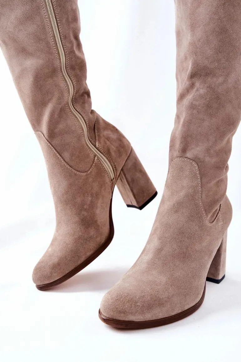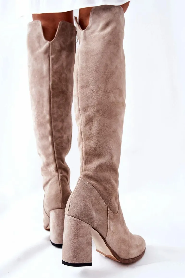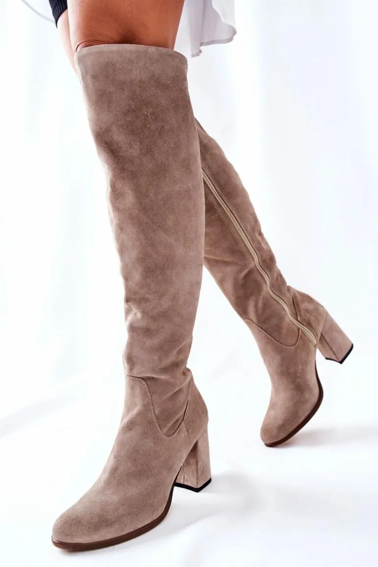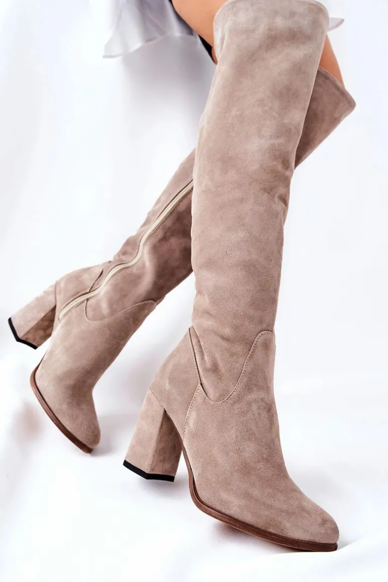 Piękne kozaki wykonane z naturalnej skóry zamszowej. Suwak na całej długości cholewki. Obcas typu słupek. Posiadają delikatne wycięcie u góry cholewki. Klasyczny wzór idealny do wielu stylizacji. Nie zwlekaj, kup dziś i zachwycaj! Sprawdź także pozostałe nasze kozaki! Przy wyborze rozmiaru prosimy sugerować się tabelą rozmiarów.