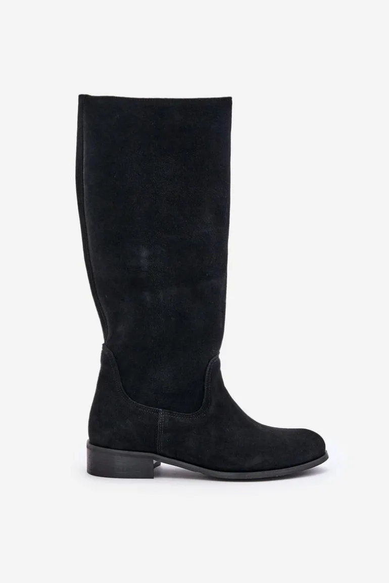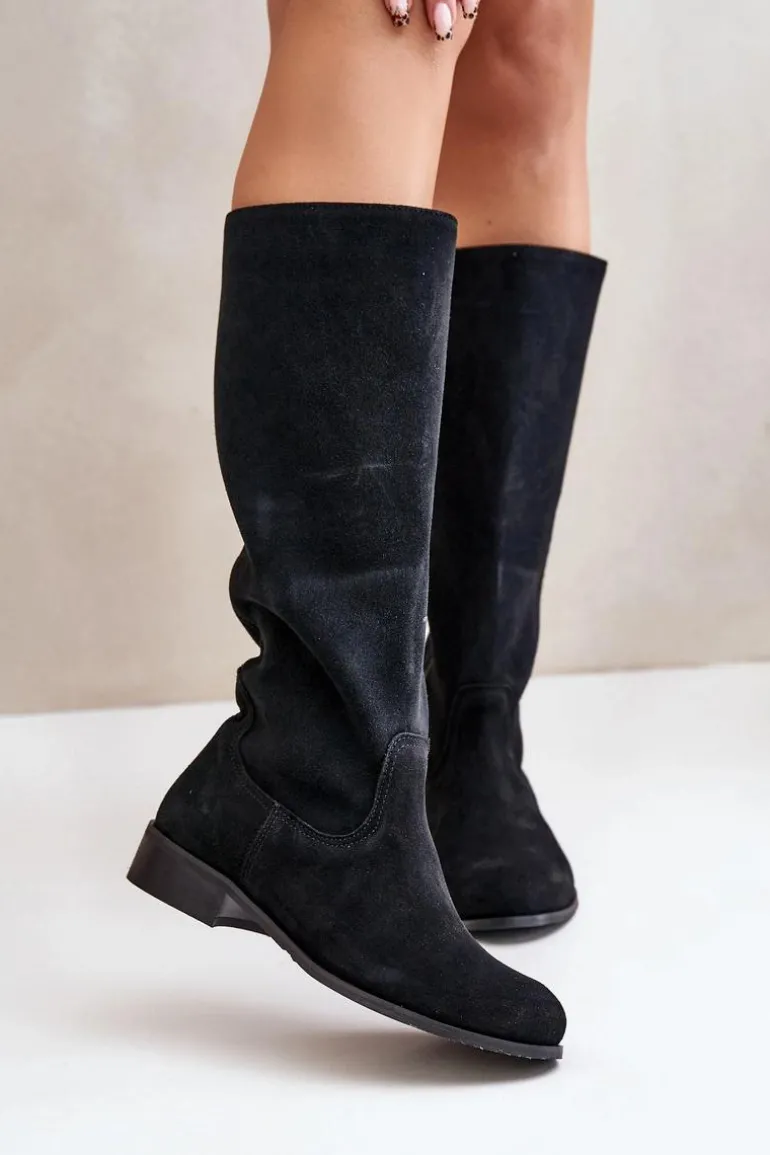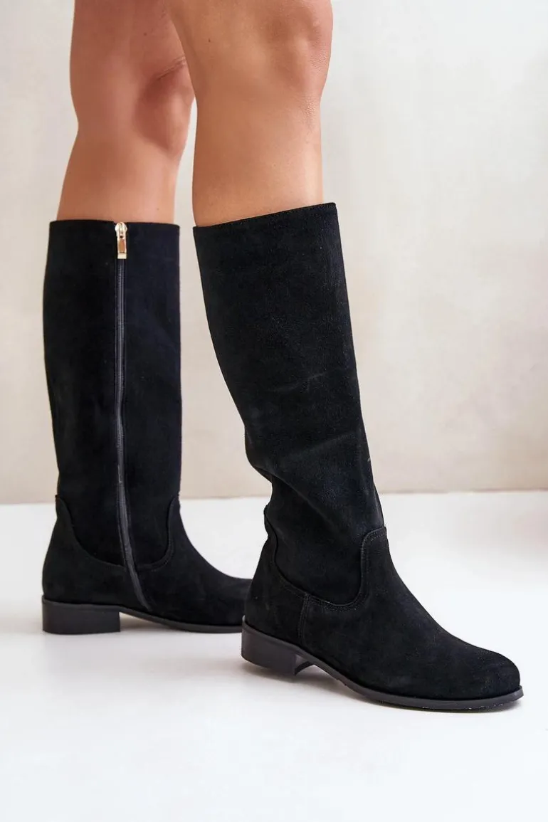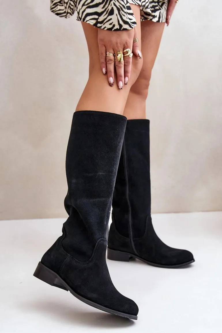 Zamszowe Kozaki Damskie Do Połowy Łydki Na Zamek Lewski 3616 Czarne