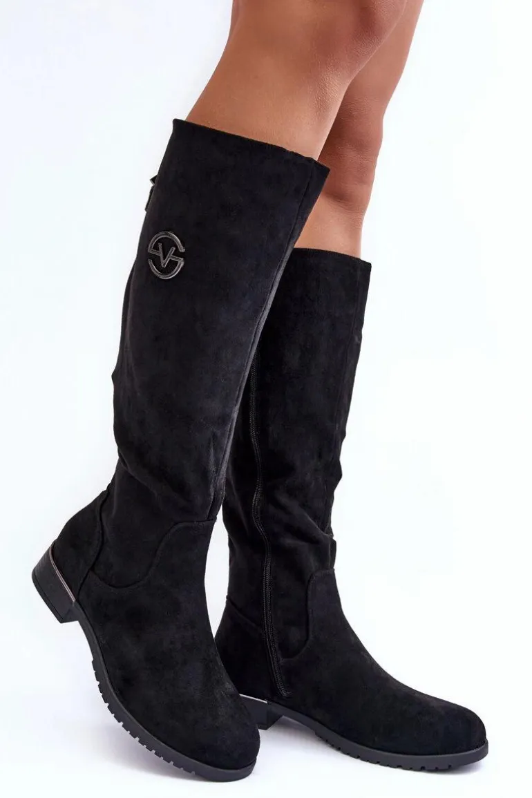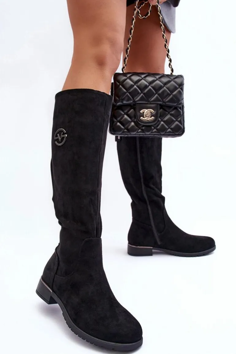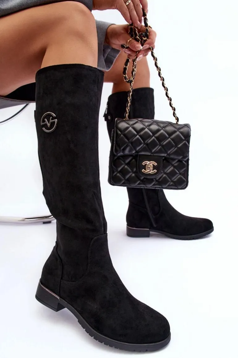 Kozaki z cholewką przed kolano osadzone na płaskim obcasie. Wykonane z eko zamszu. Wewnątrz ocieplone kocem obuwniczym. Zapinane na suwak z boku oraz dodatkowo posiadają drugi suwak z tyłu cholewki. Noski zaokrąglone. Przy wyborze rozmiaru prosimy sugerować się tabelą rozmiarów.