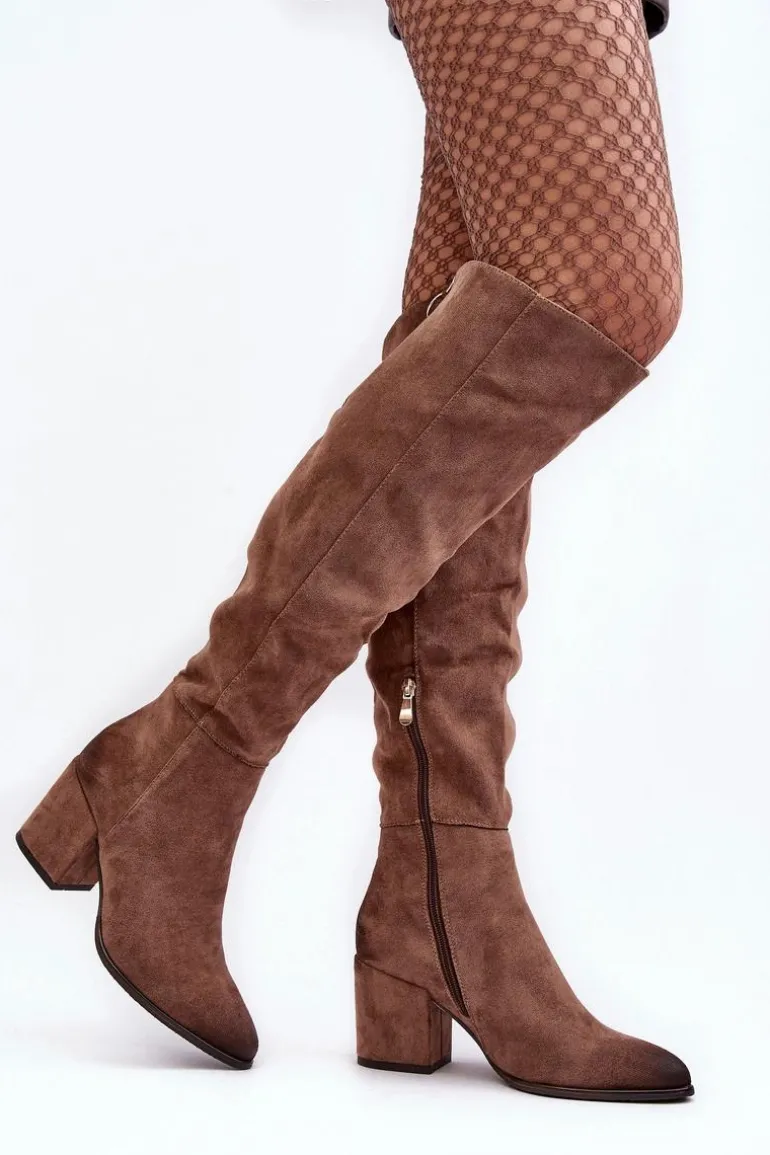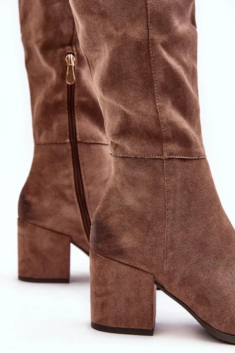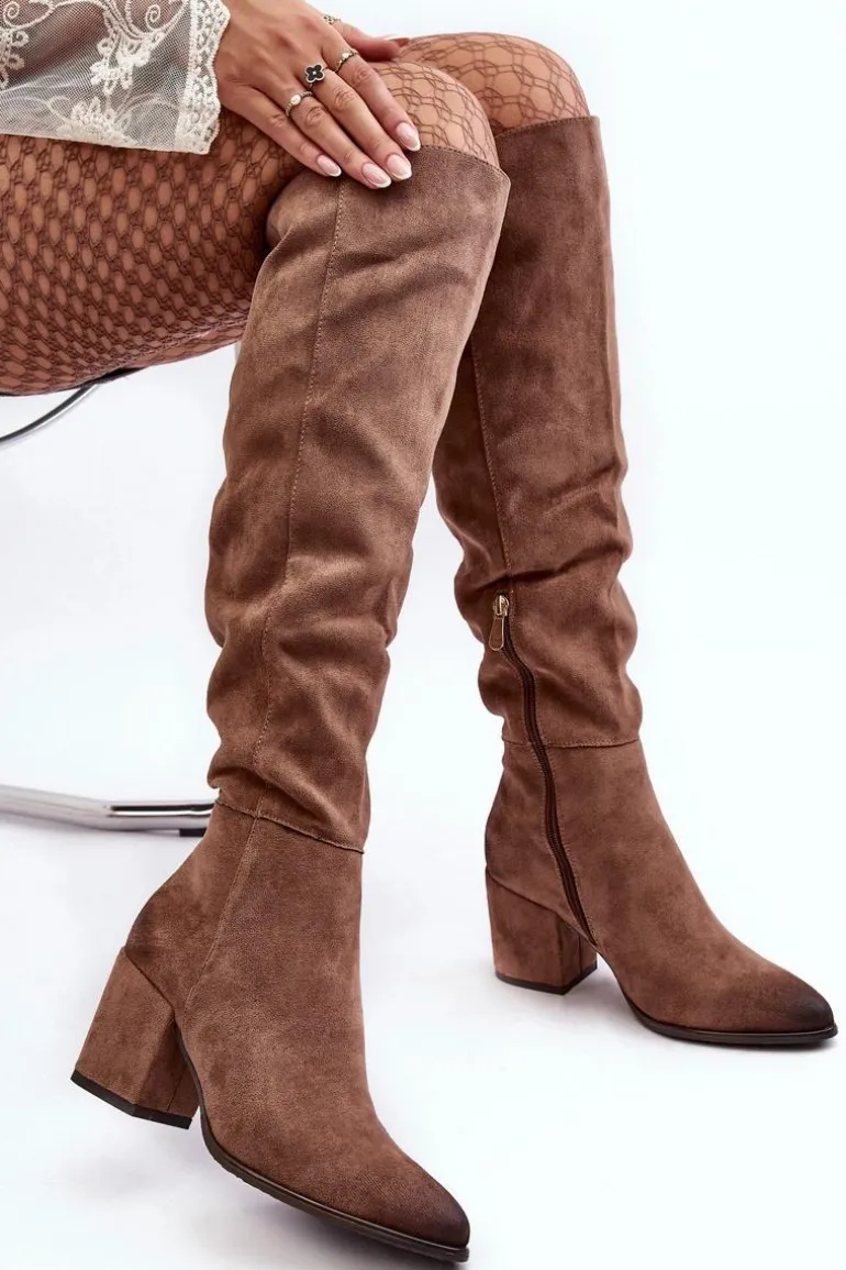Kozaki damskie z cholewką za kolano. Osadzone na obcasie w postaci słupka. Wykonane z eko zamszu. Noski w szpic optycznie wysmuklą nogi. Model wsuwany z dodatkowym suwakiem na dole cholewki. Usztywniony zapiętek. Przy wyborze rozmiaru prosimy sugerować się tabelą rozmiarów.