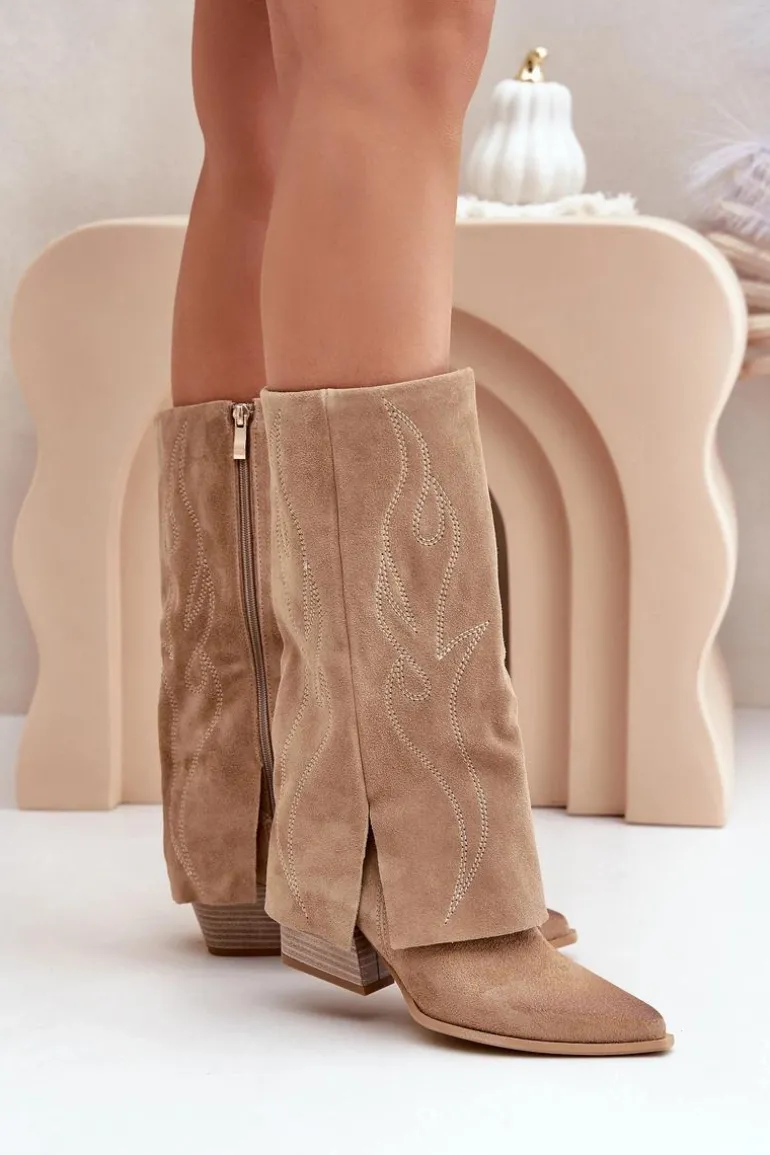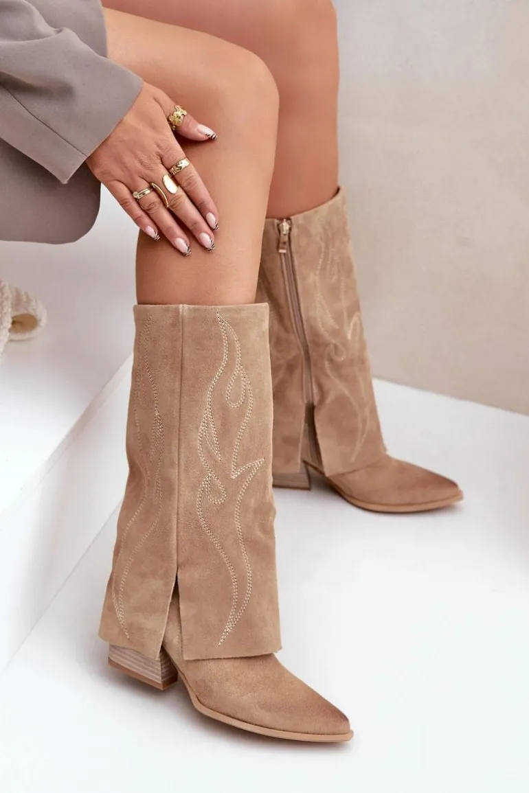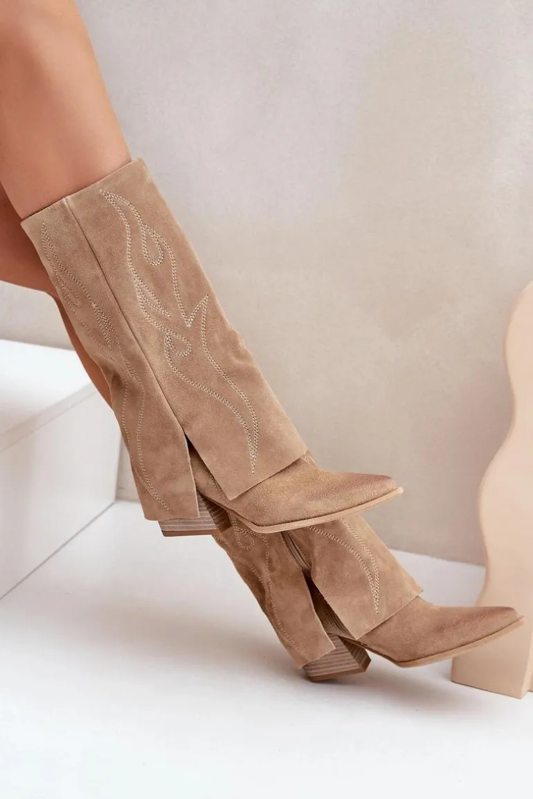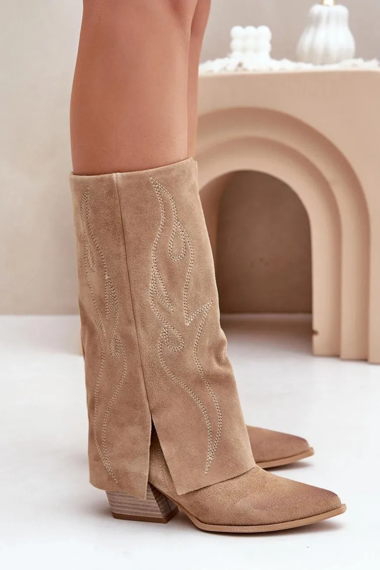 Zamszowe Kozaki Do Połowy Łydki Z Wywiniętą Cholewką Na Słupku Beżowe Zazoo 3487