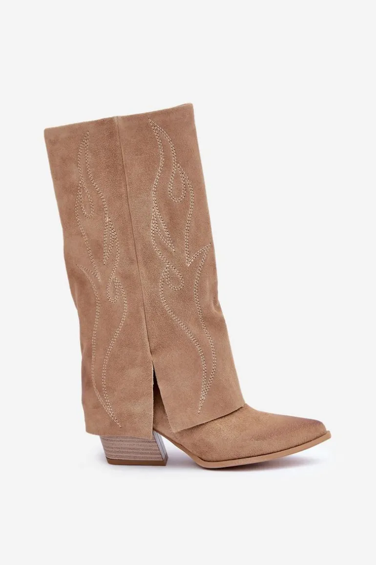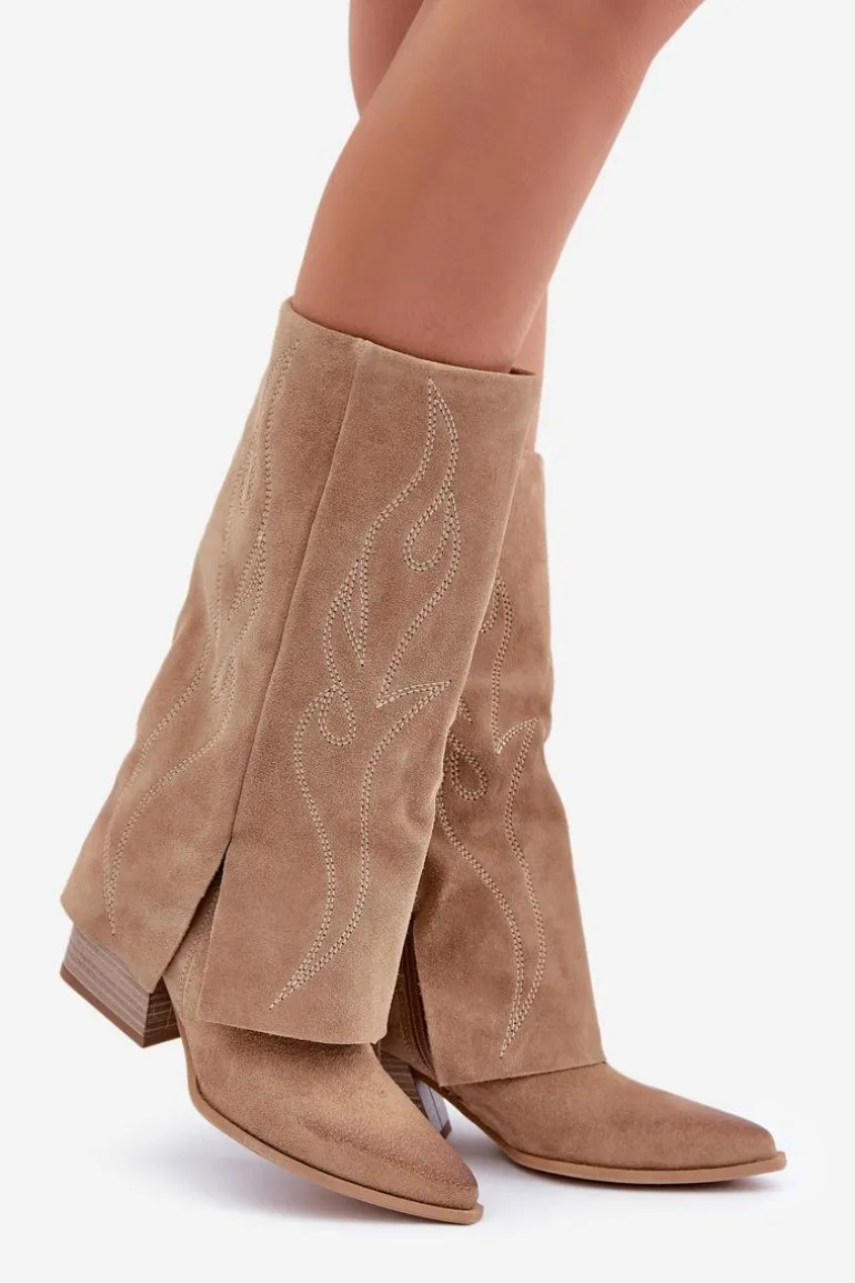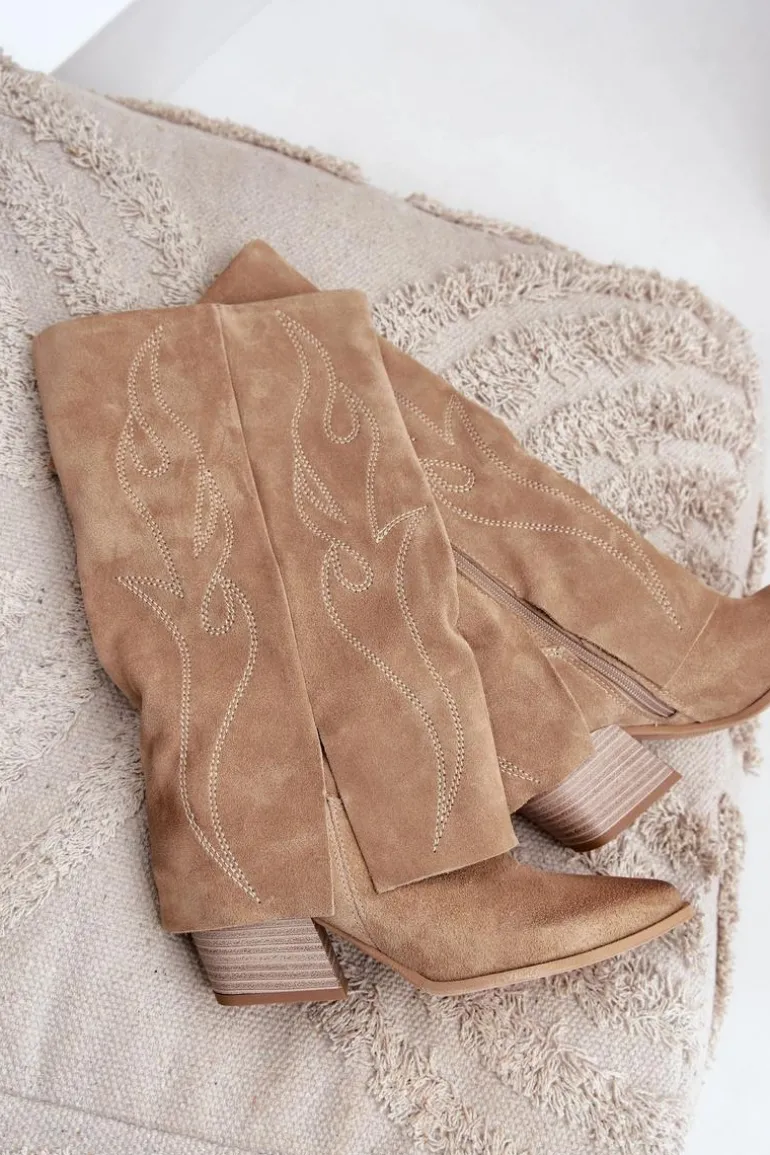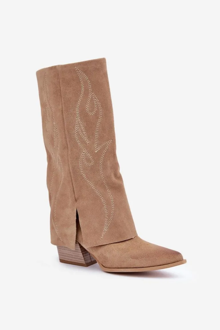 Zamszowe Kozaki Do Połowy Łydki Z Wywiniętą Cholewką Na Słupku Beżowe Zazoo 3487