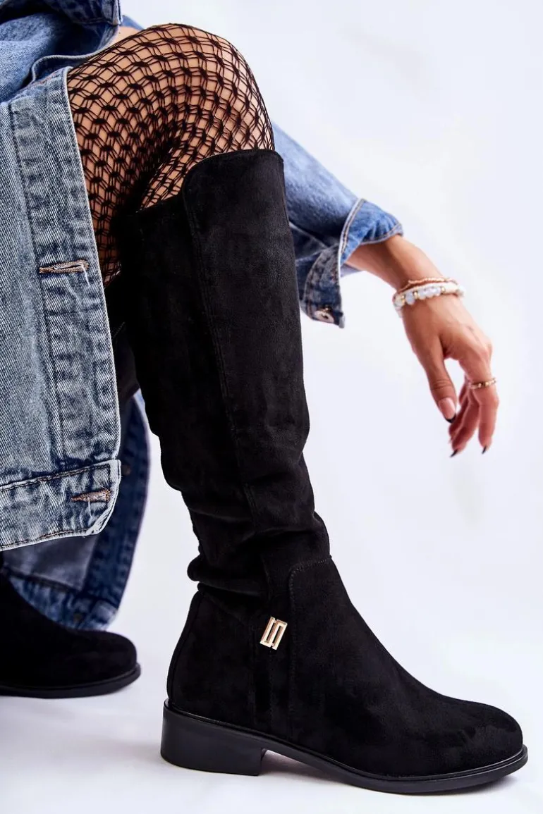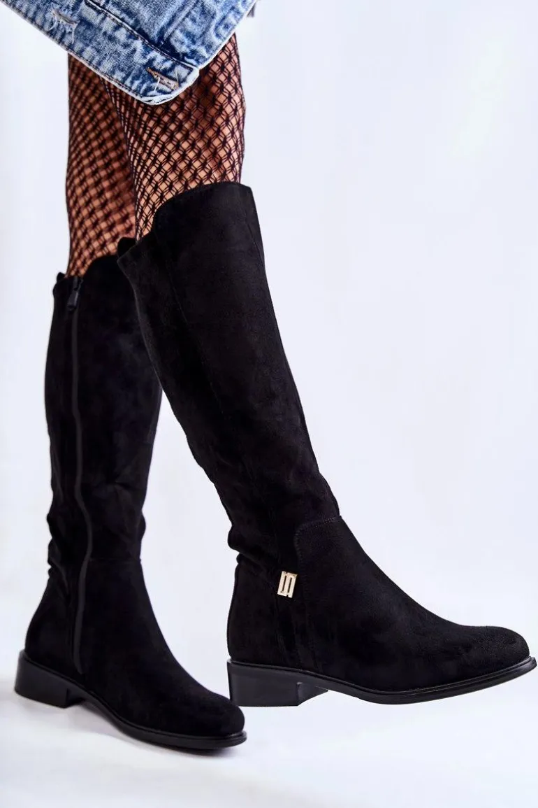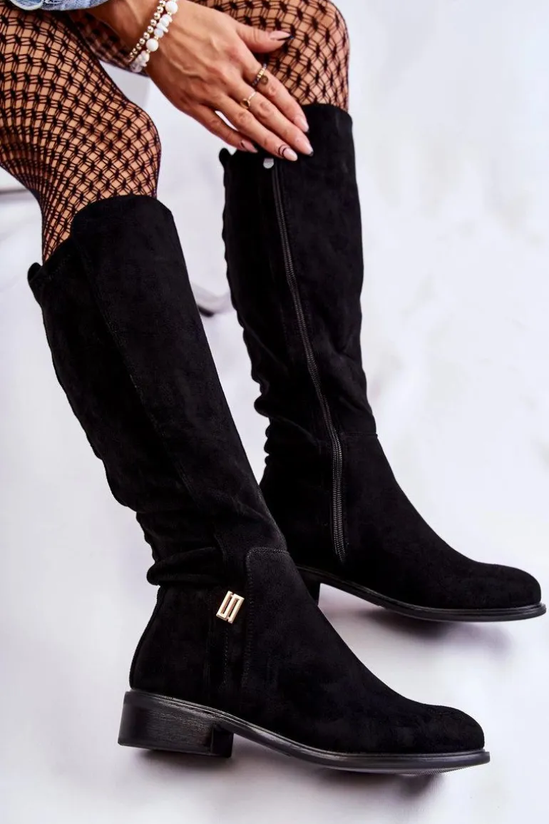Damskie kozaki wykonane z miłego w dotyku eko zamszu. Posiadają ozdobny emblemat z boku cholewki. Dodatkowo zapiętek jest usztywniany. Kozaki są częściowo ocieplane – na wysokości stopy oraz z przedniej, wewnętrznej strony cholewki. Zamykane na całej długości cholewki na suwak. Świetny model do sukienek czy dłuższych spódnic. Przy wyborze rozmiaru prosimy sugerować się tabelą rozmiarów.