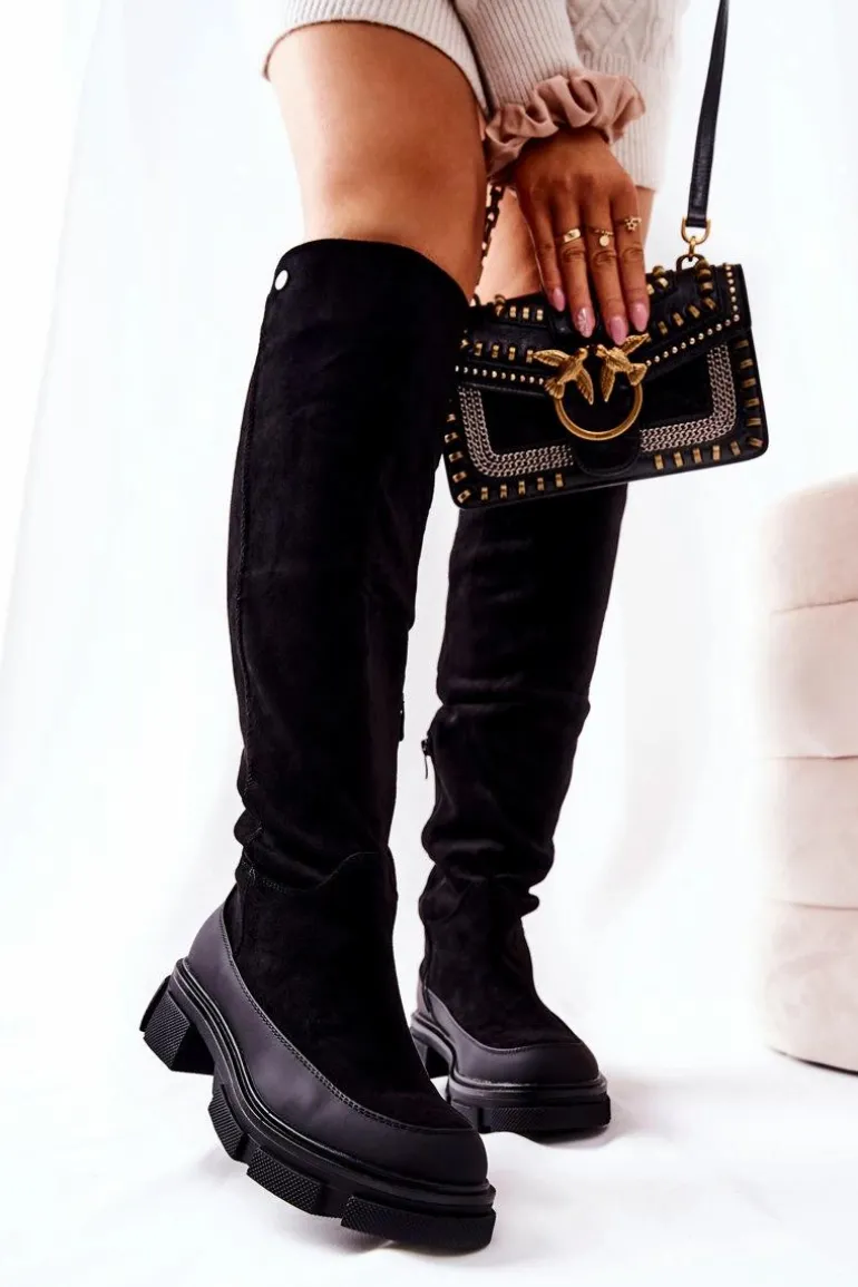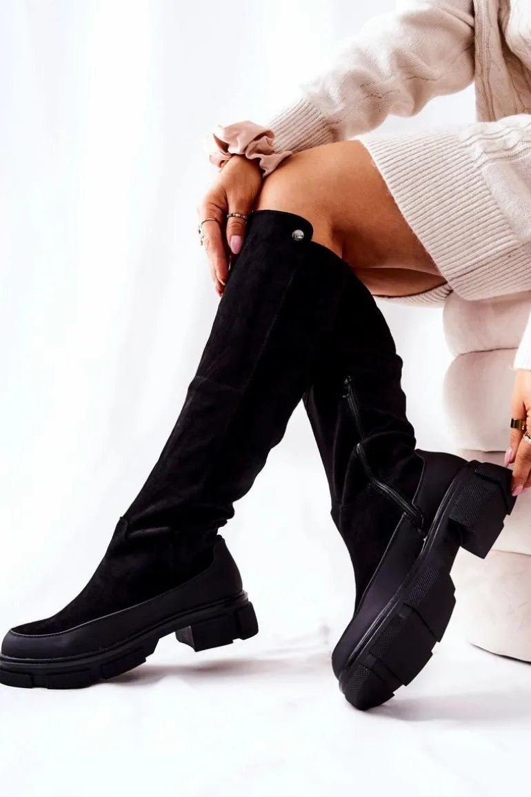 Piękne kozaki w jednym z najmodniejszych fasonów. Model wykonany z miłego w dotyku eko zamszu. Buty posiadają suwak do połowy cholewki na wewnętrznej stronie, który ułatwia zakładanie. U góry cholewki znajduje się mały emblemat. Przy podeszwie buty są wykończone materiałem z eko skóry. Przy wyborze rozmiaru prosimy sugerować się tabelą rozmiarów.