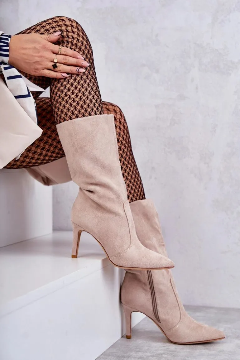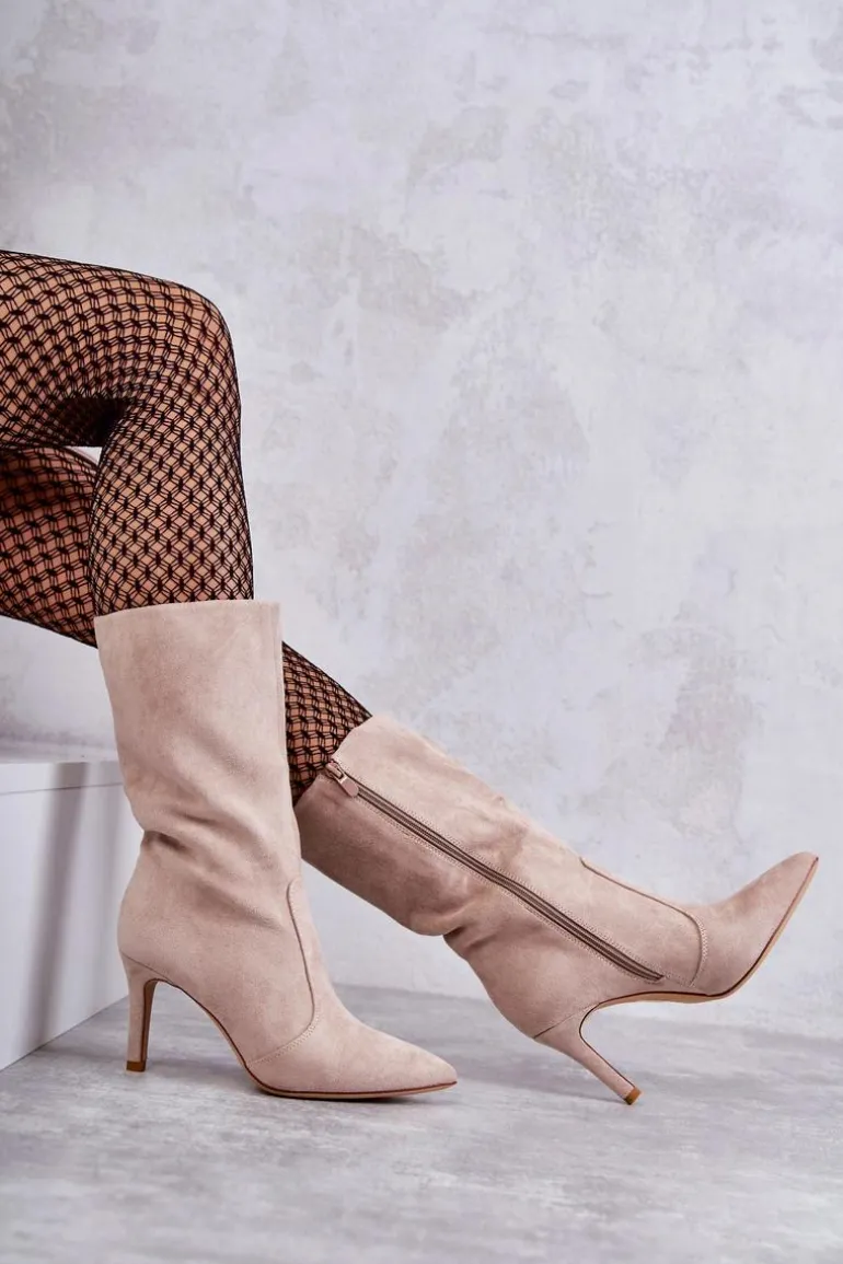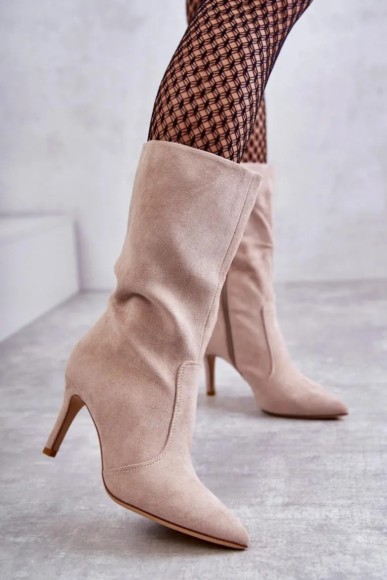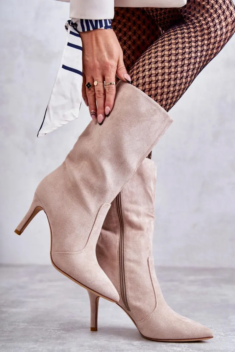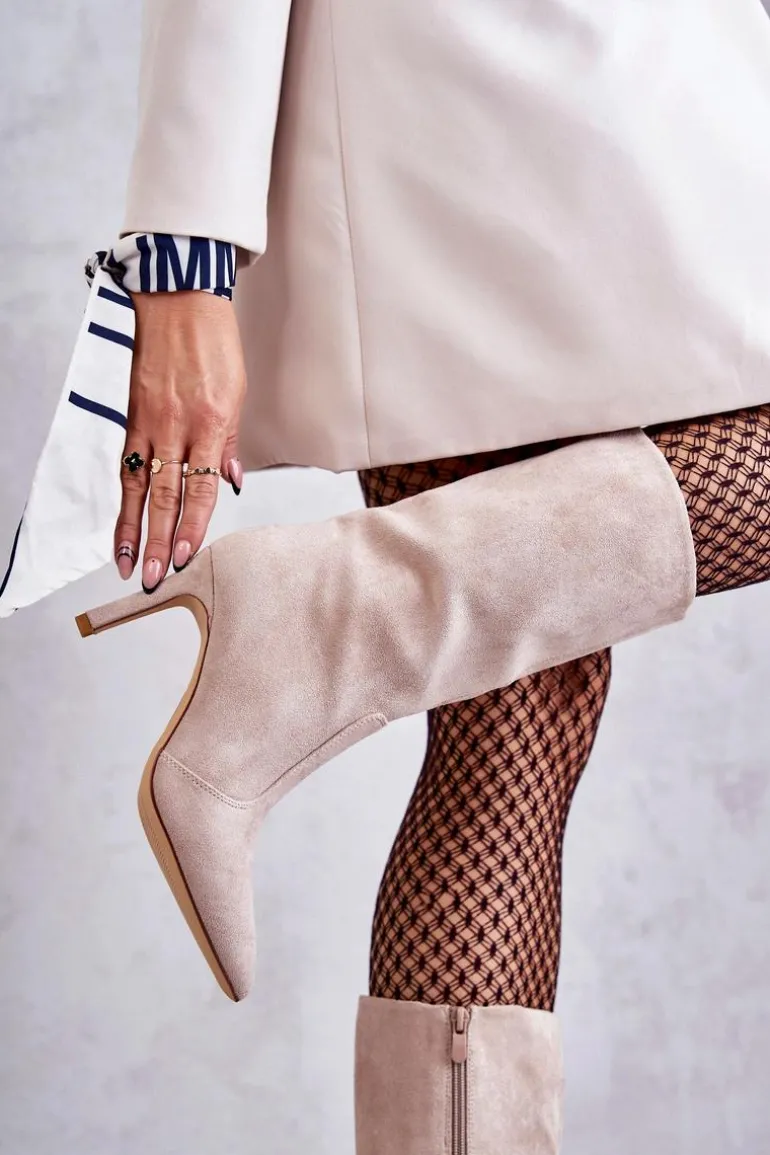 Piękne kozaki z cholewką do połowy łydki. Zostały wykonane z eko zamszu. Osadzone na obcasie w postaci niewysokiej szpilki. Posiadają usztywniany zapiętek. Model z suwakiem na całej długości cholewki. Nosek w szpic optycznie wysmukli stopę. Na pewno wykorzystasz je w wielu stylizacjach! Idealne zarówno do sukienki, jak i spodni. Musisz je mieć! Przy wyborze rozmiaru prosimy sugerować się tabelą rozmiarów.