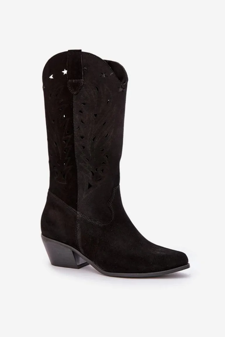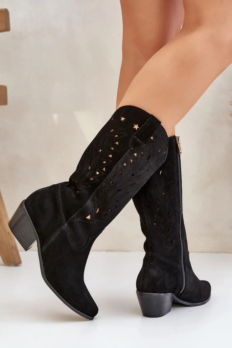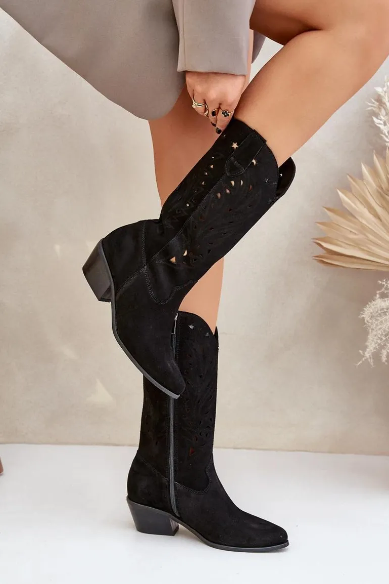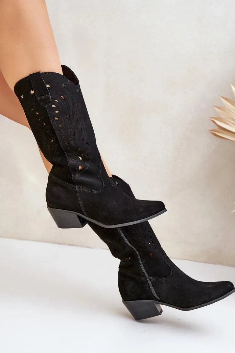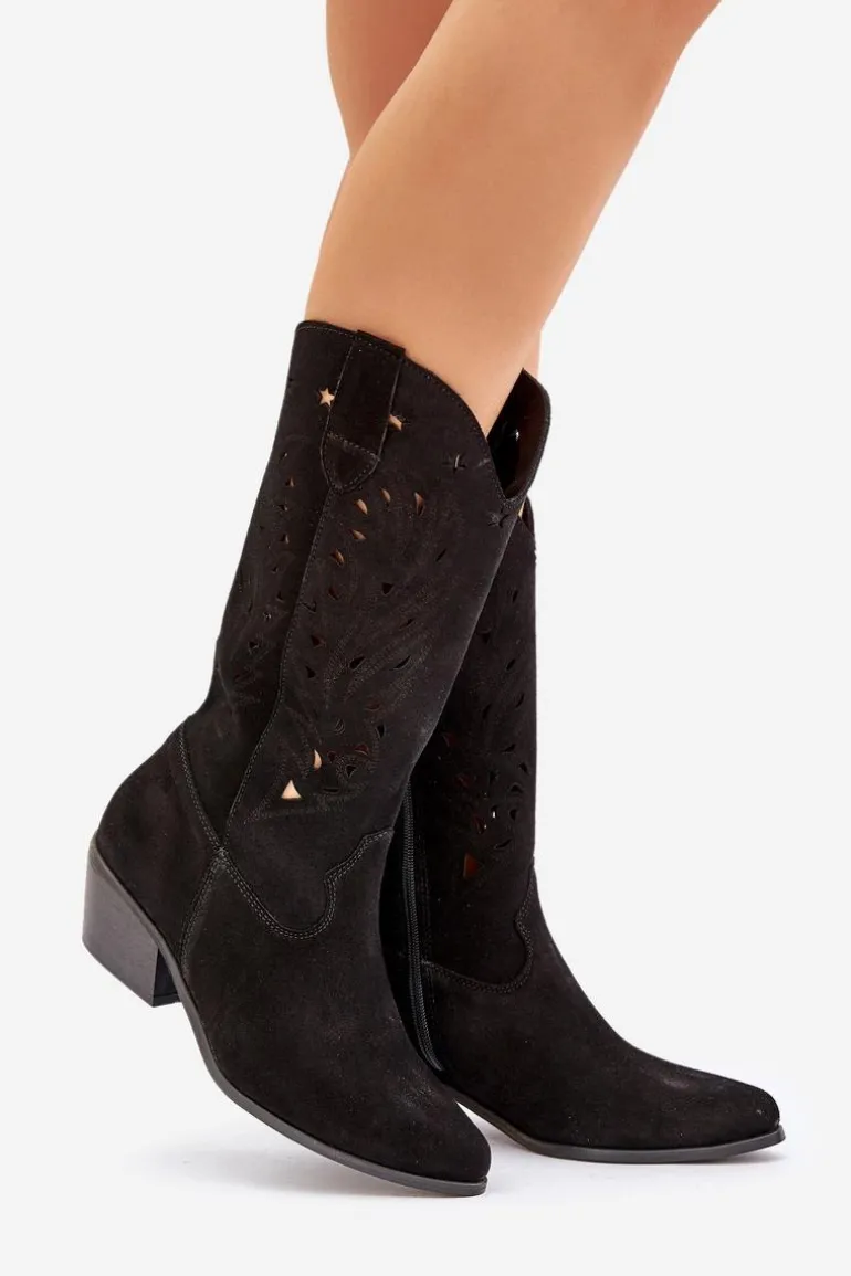 Kozaki do połowy łydki z ażurową cholewką. Zapinane na zamek. Wykonane z wysokiej jakości naturalnego zamszu. Noski w szpic. Te kozaki doskonale sprawdzą się w wielu codziennych stylizacjach. Miękka, skórzana wkładka gwarantuje komfort podczas noszenia. Ażurowe kozaki to doskonały wybór do różnych wiosennych stylizacji! Przy wyborze rozmiaru prosimy sugerować się tabelą rozmiarów.