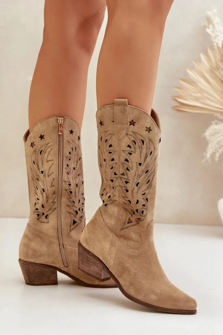Kozaki do połowy łydki z ażurową cholewką. Zapinane na zamek. Wykonane z wysokiej jakości naturalnego zamszu. Noski w szpic. Te kozaki doskonale sprawdzą się w wielu codziennych stylizacjach. Miękka, skórzana wkładka gwarantuje komfort podczas noszenia. Ażurowe kozaki to doskonały wybór do różnych wiosennych stylizacji! Przy wyborze rozmiaru prosimy sugerować się tabelą rozmiarów.