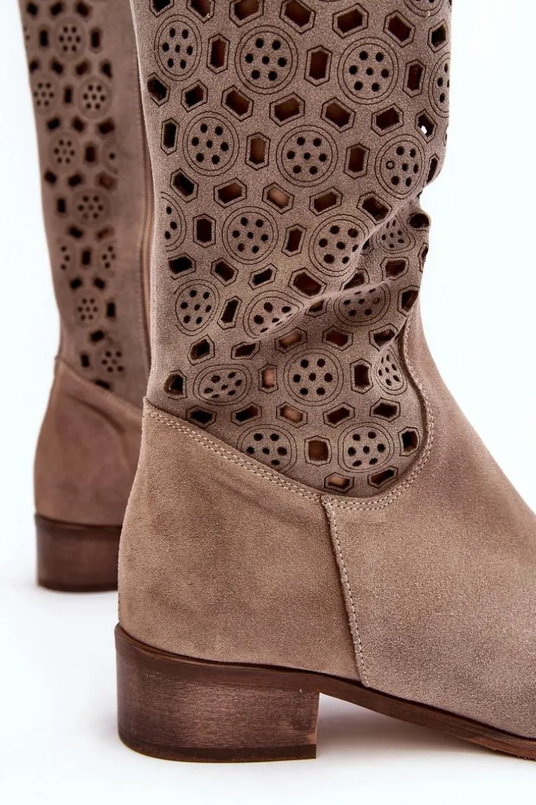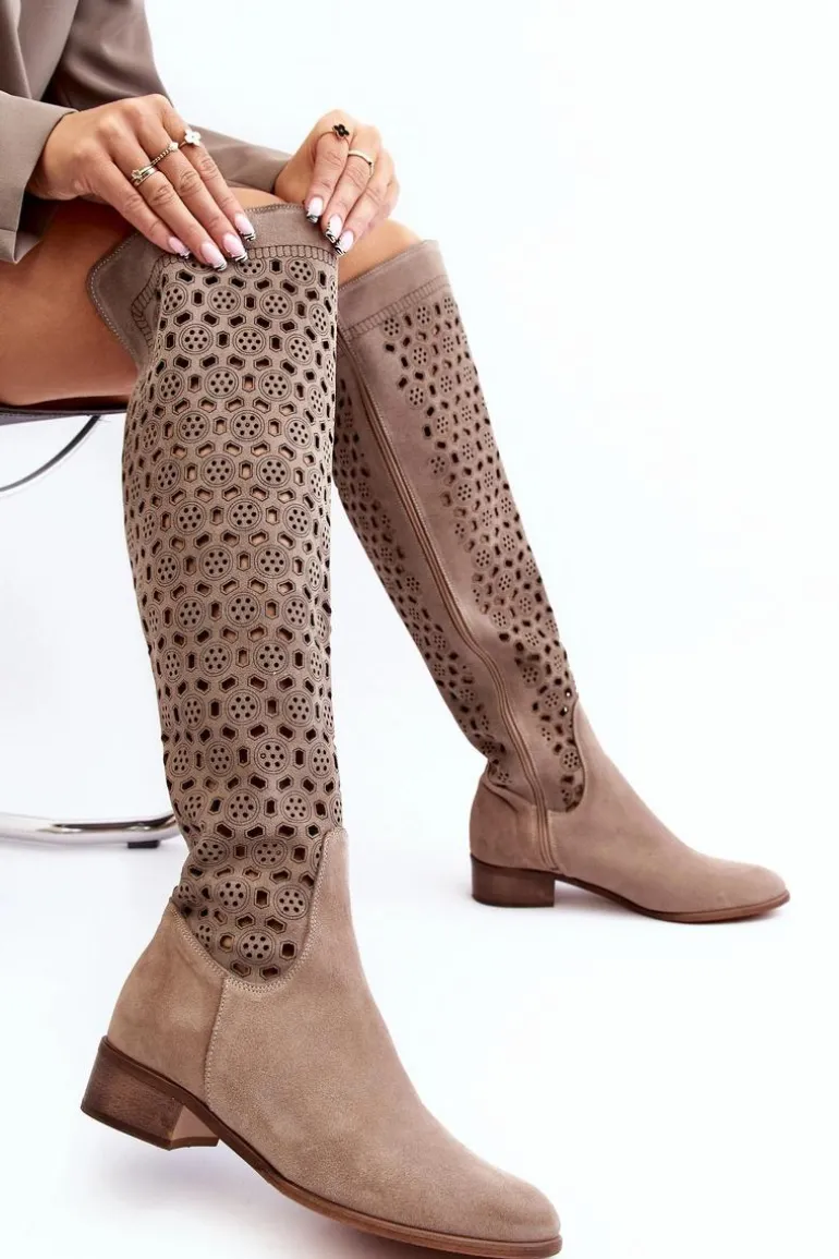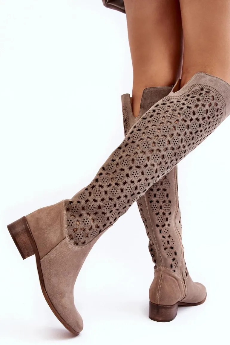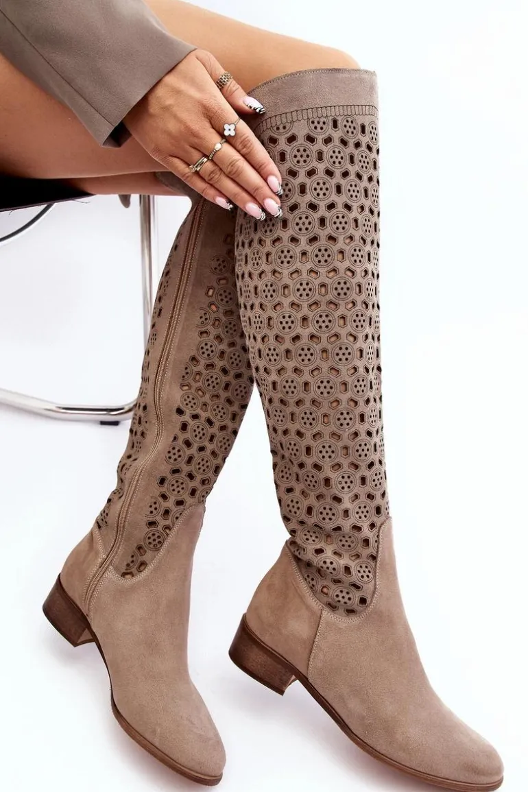 Piękne kozaki damskie od polskiego producenta. Każdy model wykonany jest z naturalnych skór wysokiej jakości. Ażurowe kozaki wykonane są z miękkiego, naturalnego zamszu. Model z zaokrąglonym noskiem. Cholewka na całości zapinana na suwak. Ozdobne wycięcie na górze. Płaski obcas oraz skórzana, miękka wkładka to gwarancja stabilności oraz komfortu podczas użytkowania. Idealny model na sezon wiosenno-letni! Przy wyborze rozmiaru prosimy sugerować się tabelą rozmiarów.