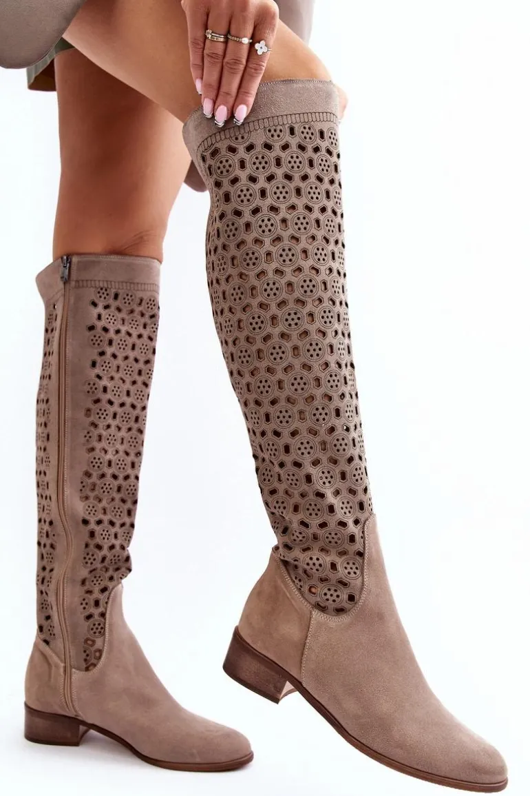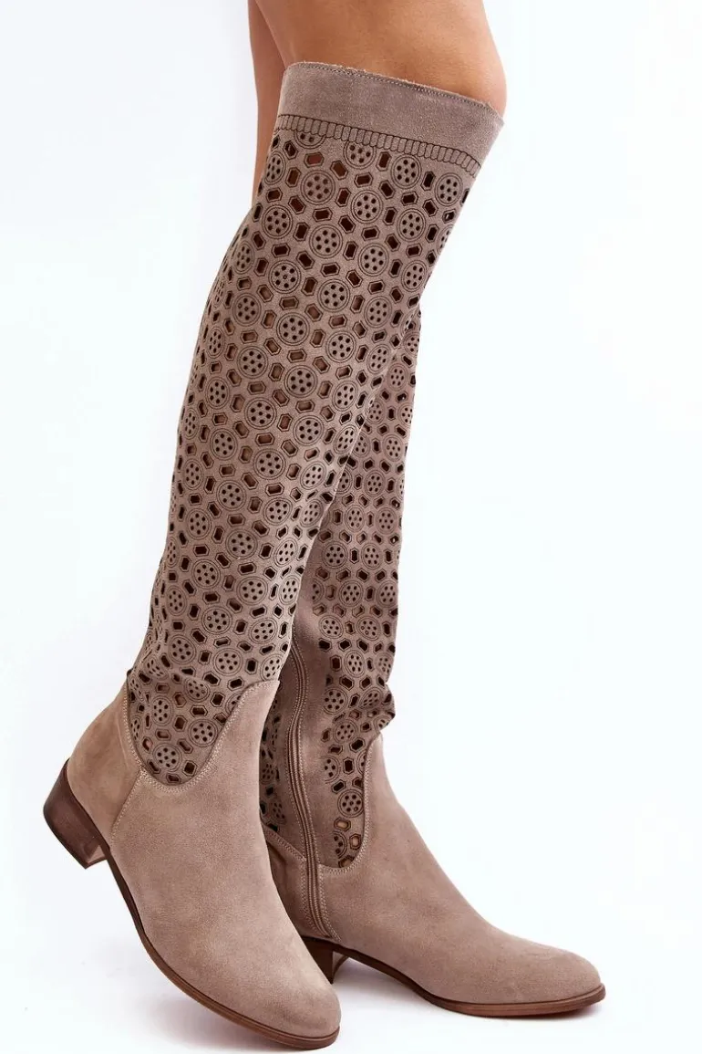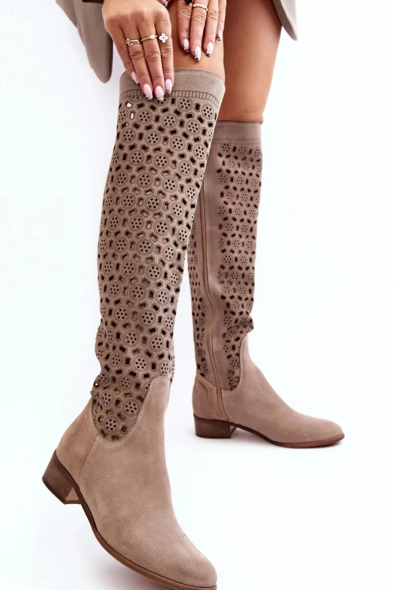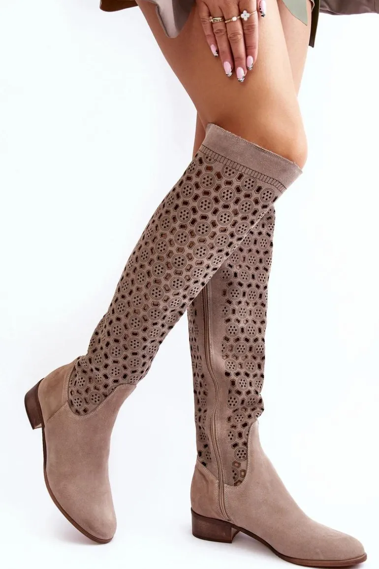 Piękne kozaki damskie od polskiego producenta. Każdy model wykonany jest z naturalnych skór wysokiej jakości. Ażurowe kozaki wykonane są z miękkiego, naturalnego zamszu. Model z zaokrąglonym noskiem. Cholewka na całości zapinana na suwak. Ozdobne wycięcie na górze. Płaski obcas oraz skórzana, miękka wkładka to gwarancja stabilności oraz komfortu podczas użytkowania. Idealny model na sezon wiosenno-letni! Przy wyborze rozmiaru prosimy sugerować się tabelą rozmiarów.