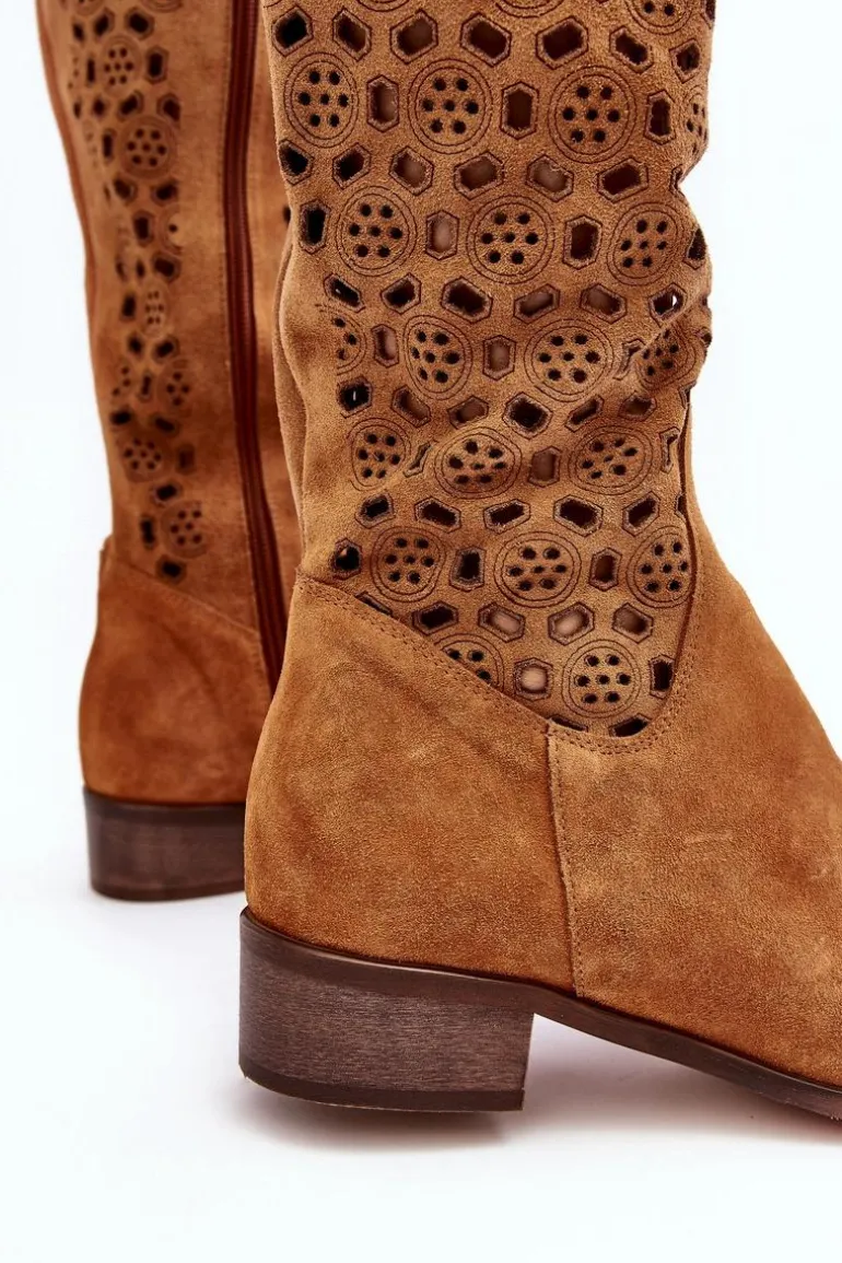 Piękne kozaki damskie od polskiego producenta. Każdy model wykonany jest z naturalnych skór wysokiej jakości. Ażurowe kozaki wykonane są z miękkiego, naturalnego zamszu. Model z zaokrąglonym noskiem. Cholewka na całości zapinana na suwak. Ozdobne wycięcie na górze. Płaski obcas oraz skórzana, miękka wkładka to gwarancja stabilności oraz komfortu podczas użytkowania. Idealny model na sezon wiosenno-letni! Przy wyborze rozmiaru prosimy sugerować się tabelą rozmiarów.