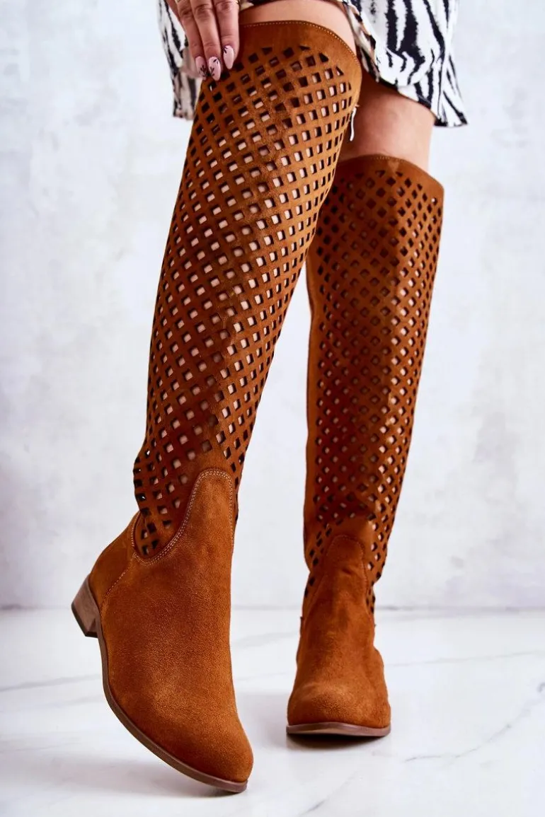 Piękne kozaki damskie od polskiego producenta. Każdy model wykonany jest z naturalnych skór wysokiej jakości. Ażurowe kozaki wykonane są z miękkiego, naturalnego zamszu. Model z zaokrąglonym noskiem. Cholewka na całości zapinana na suwak. Ozdobne wycięcie na górze. Płaski obcas oraz skórzana, miękka wkładka to gwarancja stabilności oraz komfortu podczas użytkowania. Idealny model na sezon wiosenno-letni! Przy wyborze rozmiaru prosimy sugerować się tabelą rozmiarów.