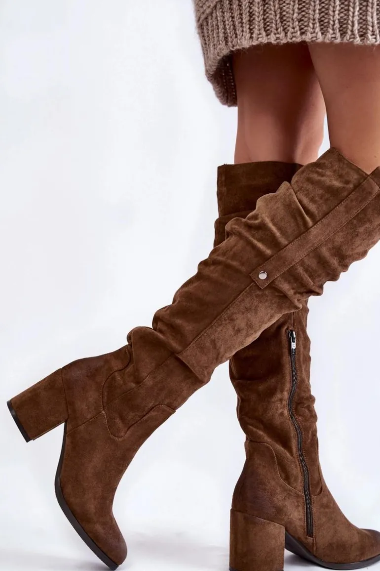 Rewelacyjne kozaki damskie zostały wykonane z wysokiej jakości eko zamszu z dbałością o szczegóły. Model ten został osadzony na niskim obcasie w postaci słupka. Kozaki z cholewką za kolano zostały przyozdobione delikatnym marszczeniem oraz pojedynczą napą z boku cholewki. Zapinane na suwak oraz wsuwane. Dodatkowo zapiętek jest usztywniany. Kozaki zostały ocieplone delikatnym futerkiem. Przy wyborze rozmiaru prosimy sugerować się tabelą rozmiarów.