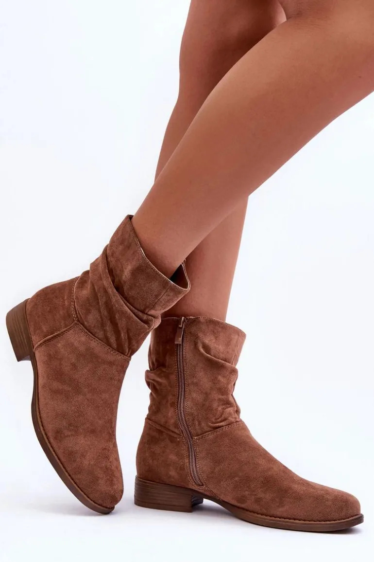 Botki damskie osadzone na płaskim obcasie, z marszczoną cholewką. Wykonane z eko zamszu. Zapinane na suwak z boku. Model ten posiada usztywniany, zapiętek, co zwiększy stabilizację stopy. Koniecznie powinnaś mieć je w swojej szafie! Przy wyborze rozmiaru prosimy sugerować się tabelą rozmiarów.