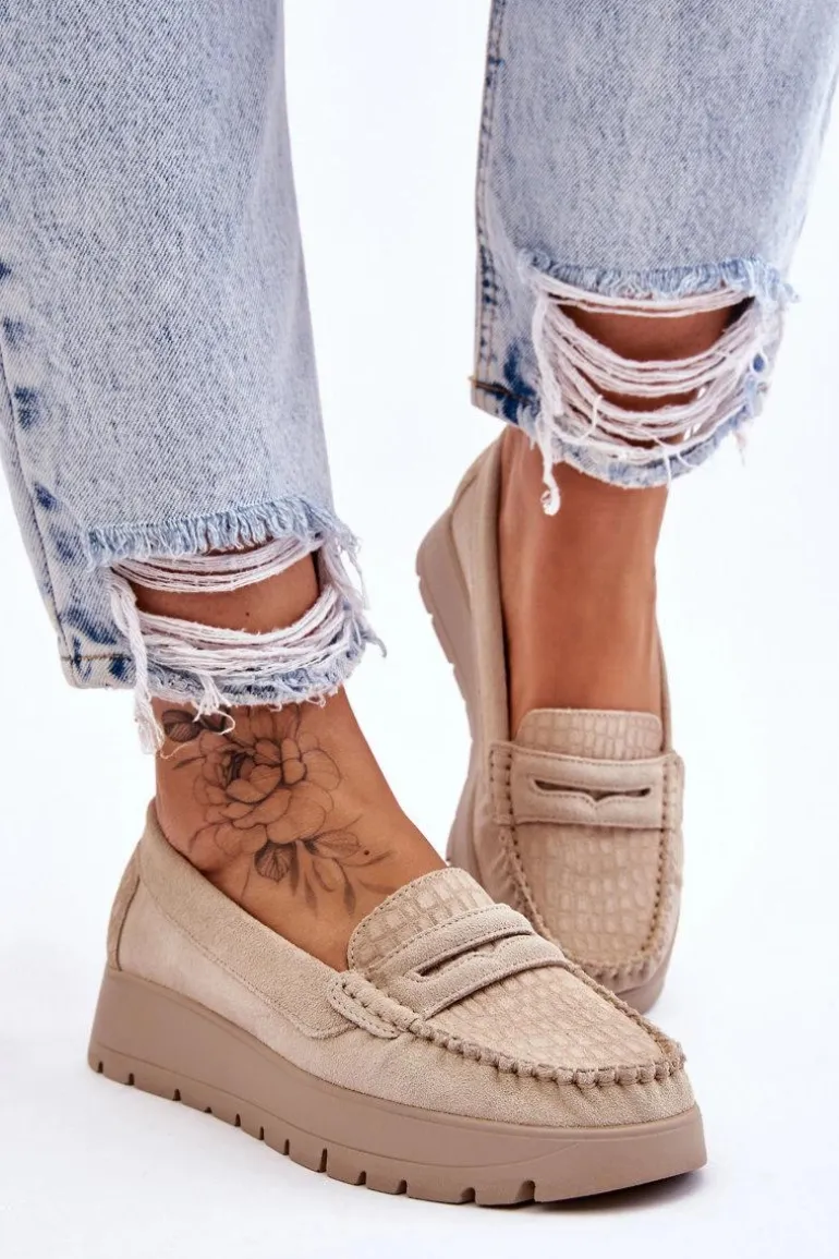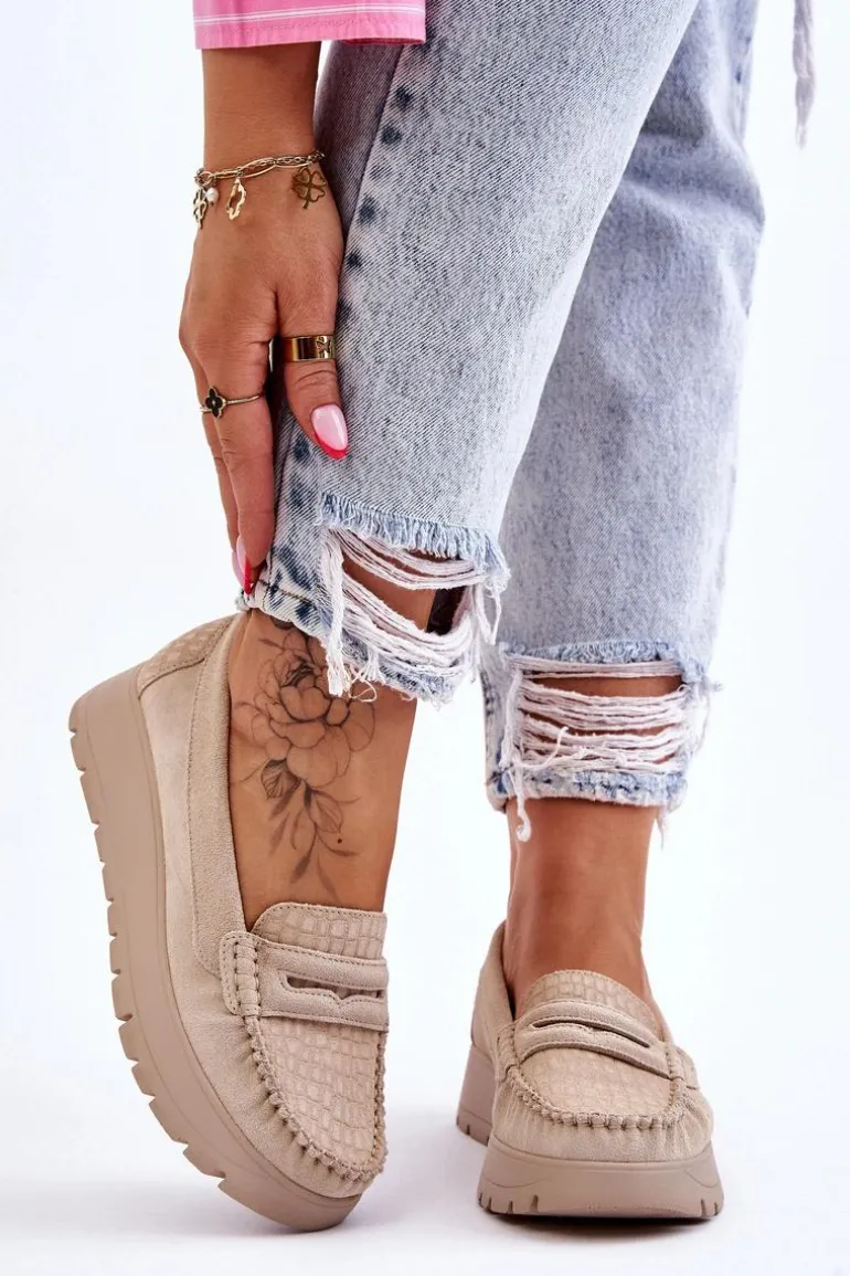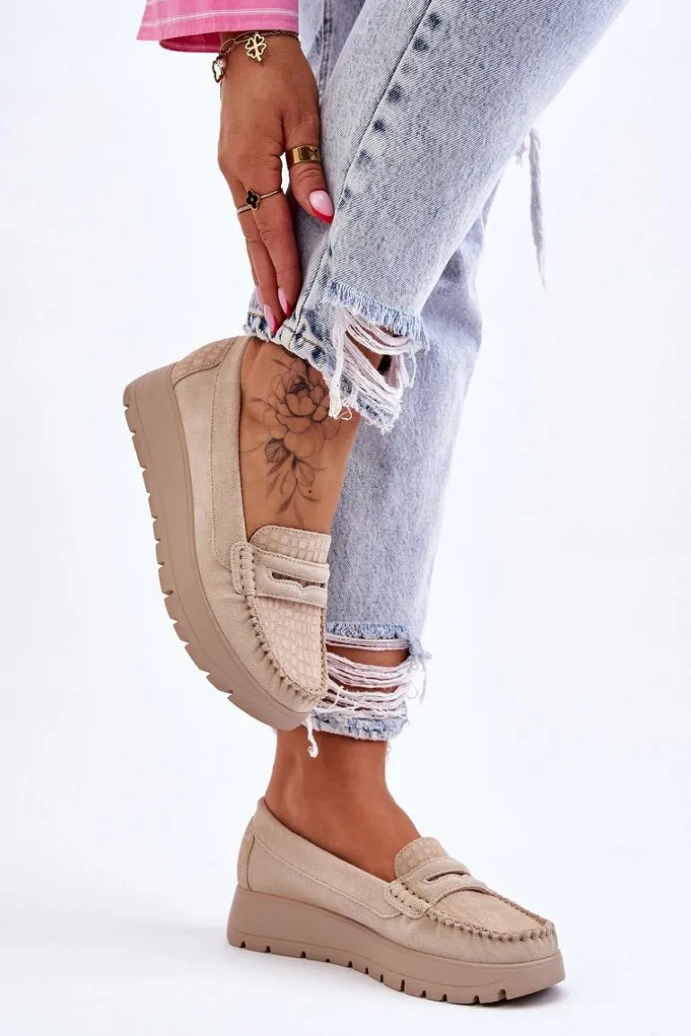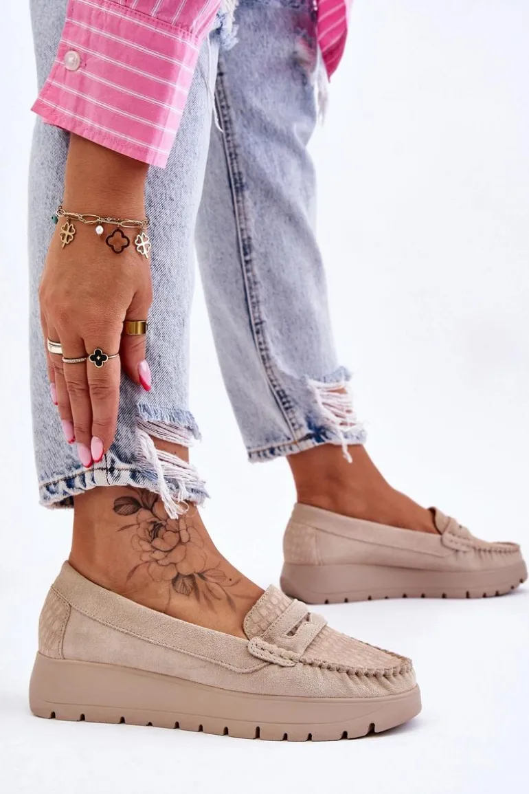 Mokasyny damskie wykonane z naturalnej skóry z ozdobnym paseczkiem z przodu. Zapiętek został usztywniony, co pozwoli na odpowiednią stabilizację stopy. Buty osadzono na platformie. Ten model posiada miękką wkładkę z perforacją. Mokasyny to idealne buty do wielu stylizacji! Koniecznie powinnaś je mieć! Przy wyborze rozmiaru prosimy sugerować się tabelą rozmiarów.