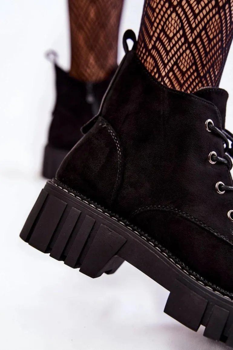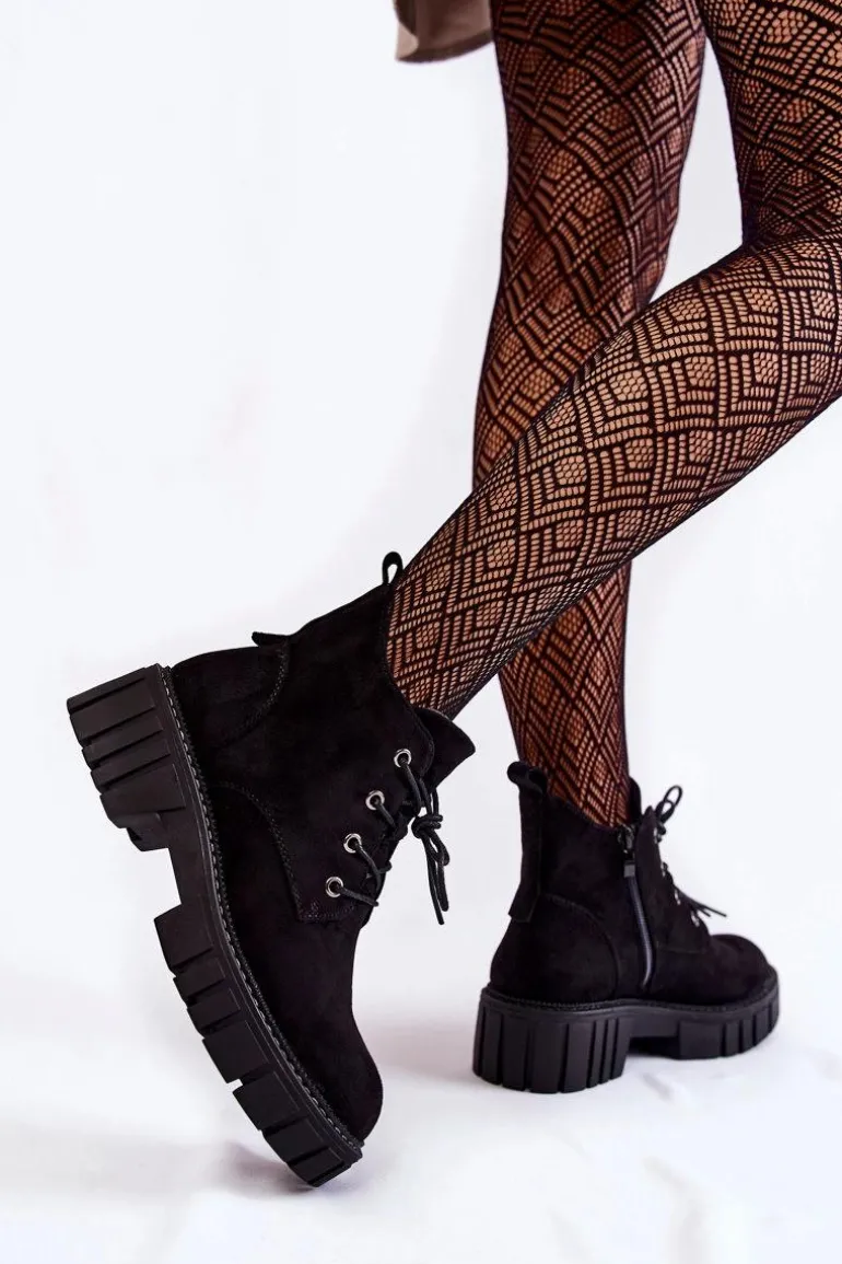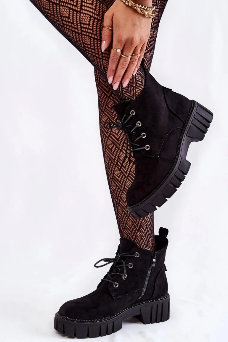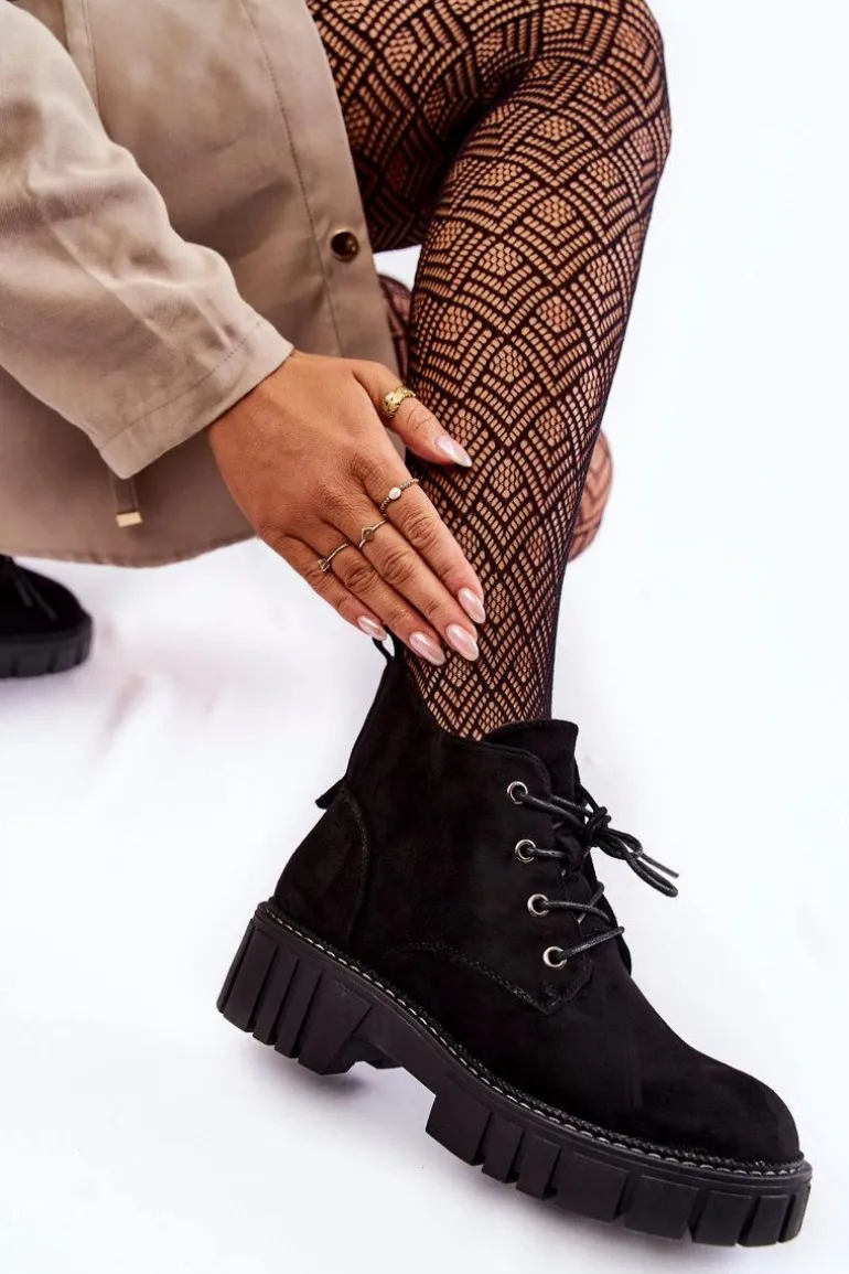 Botki damskie o klasycznym fasonie świetnie sprawdzą się na jesienne, chłodne dni. Posiadają wewnątrz ocieplenie w postaci koca obuwniczego. Osadzone na płaskim, stabilnym obcasie ze żłobieniami. Dodatkowo posiadają usztywniany zapiętek. Model z suwakiem na boku cholewki oraz sznurowaniem. Botki doskonale sprawdzą się w wielu stylizacjach. Przy wyborze rozmiaru prosimy sugerować się tabelą rozmiarów.