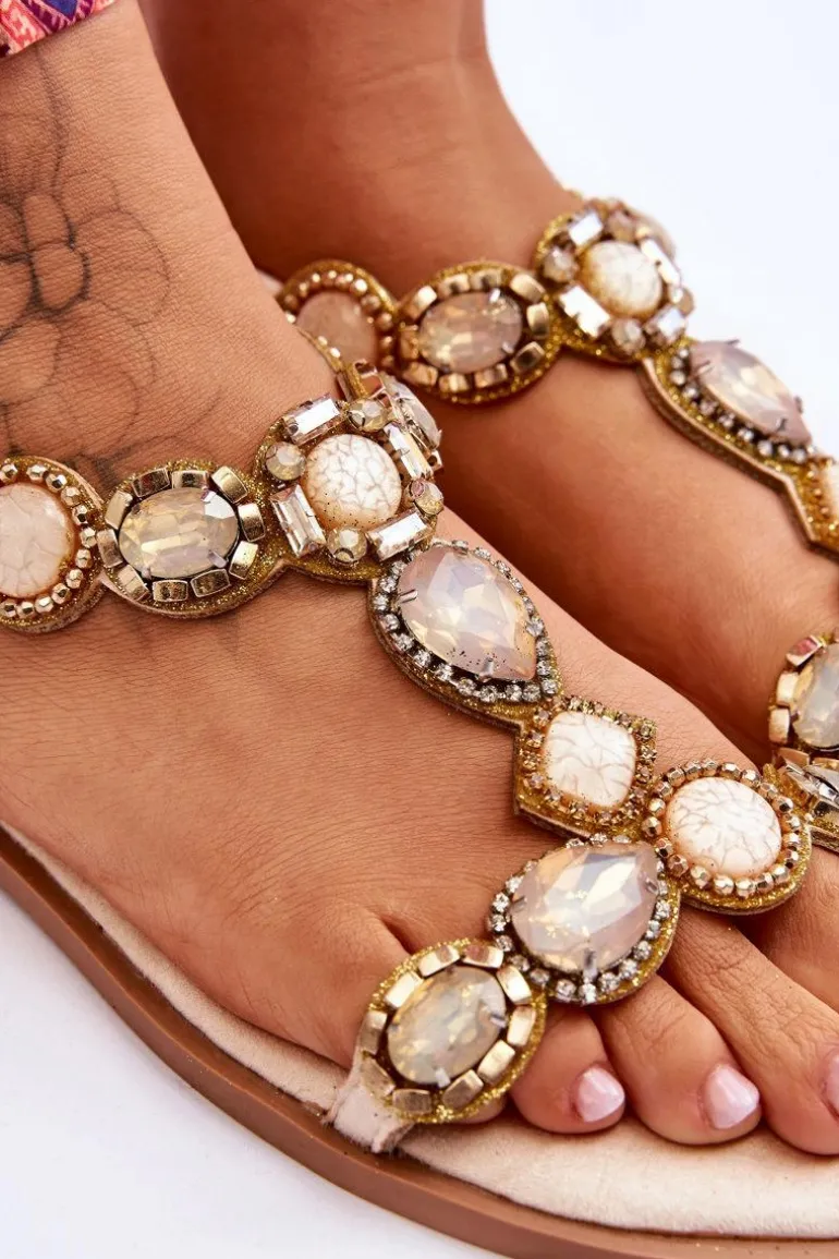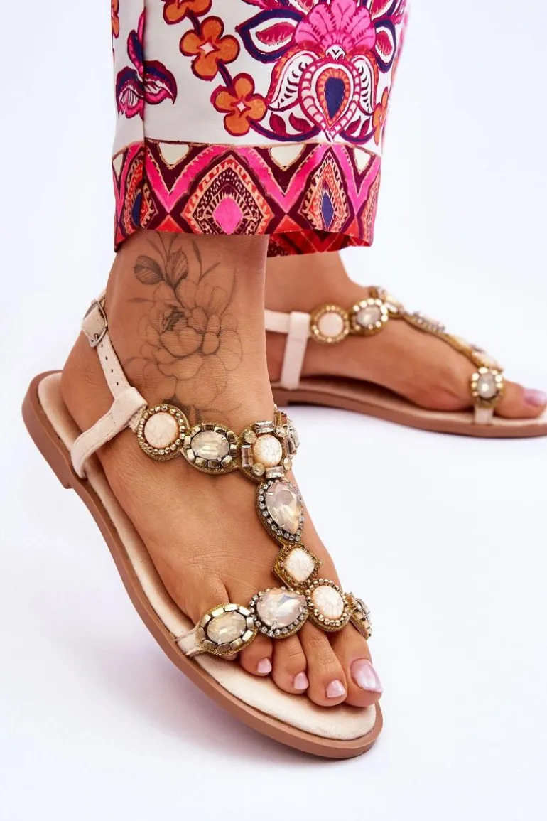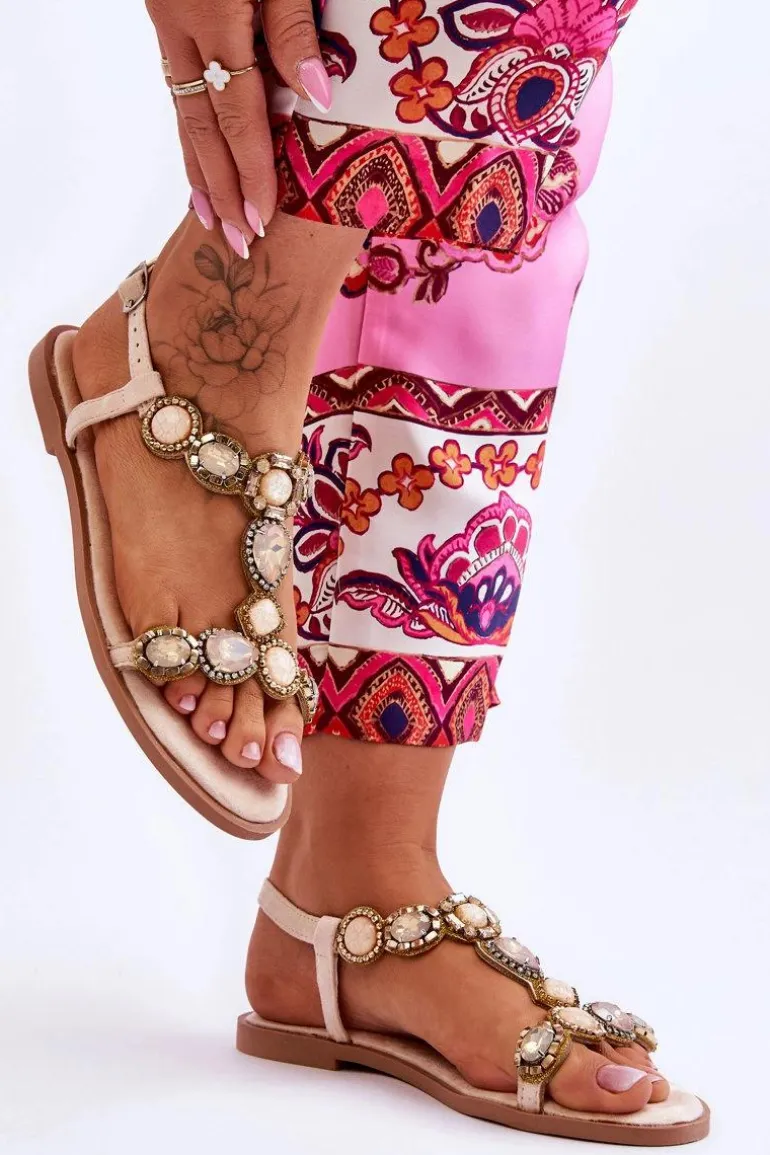 Piękne, damskie sandałki zostały wykonane z miłego w dotyku eko zamszu. Model ten posiada zdobienia w postaci brokatu, kamieni i mieniących się dżetów. Sandałki są zapinane na regulowany pasek ze sprzączką. Wygodna wkładka z eko zamszu świetnie sprawdzi się podczas długiego użytkowania obuwia. Sandałki osadzono na płaskim obcasie z antypoślizgową podeszwą. Przy wyborze rozmiaru prosimy kierować się tabelą rozmiarów.
