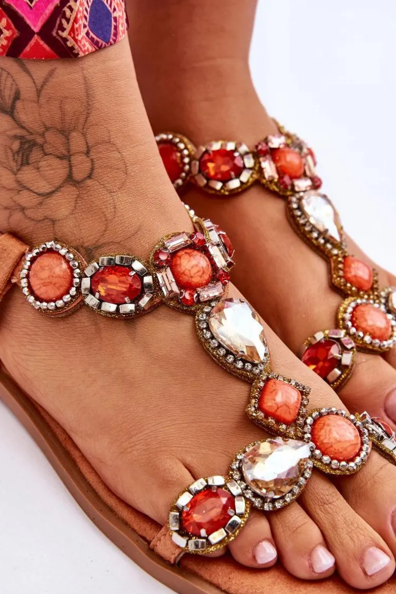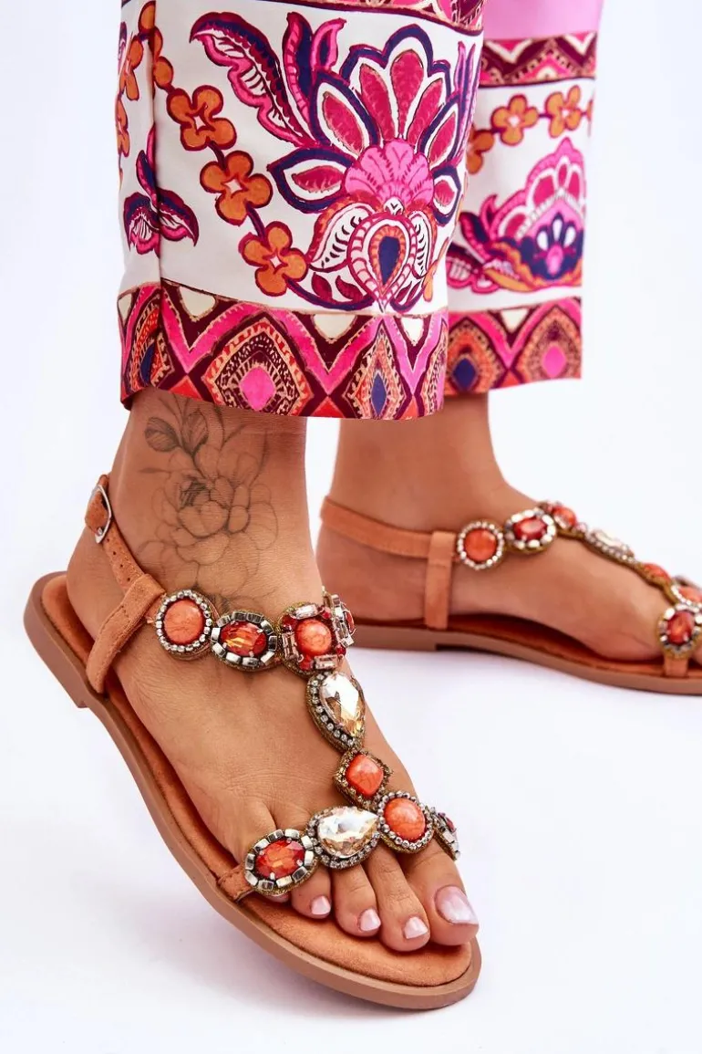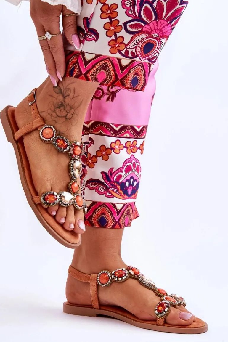 Piękne, damskie sandałki zostały wykonane z miłego w dotyku eko zamszu. Model ten posiada zdobienia w postaci brokatu, kamieni i mieniących się dżetów. Sandałki są zapinane na regulowany pasek ze sprzączką. Wygodna wkładka z eko zamszu świetnie sprawdzi się podczas długiego użytkowania obuwia. Sandałki osadzono na płaskim obcasie z antypoślizgową podeszwą. Przy wyborze rozmiaru prosimy kierować się tabelą rozmiarów.
