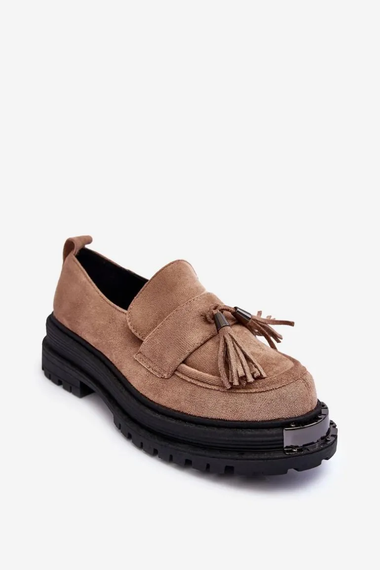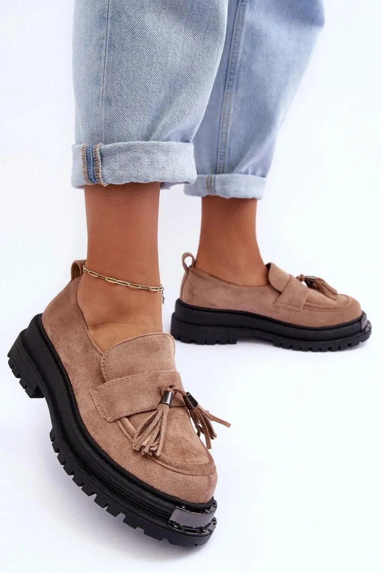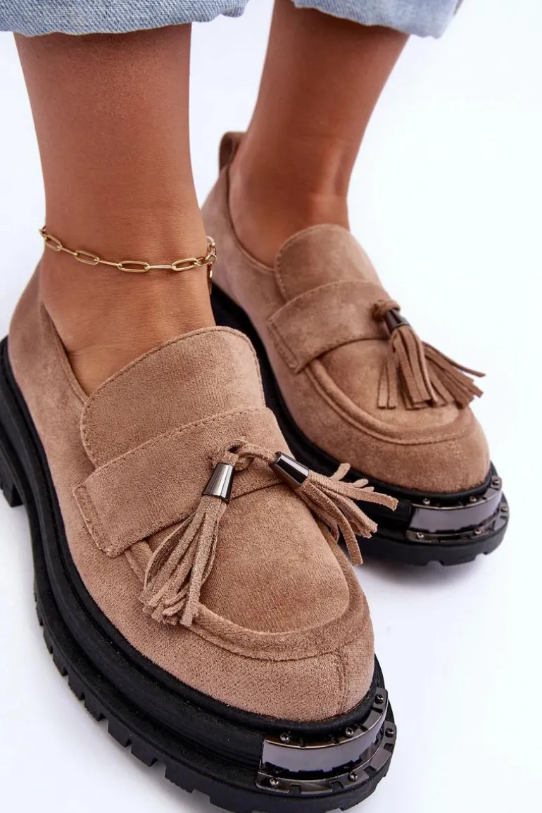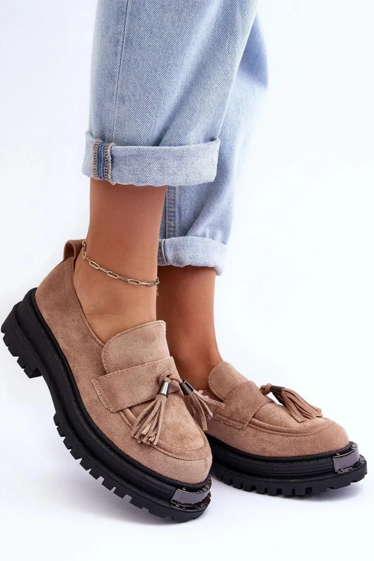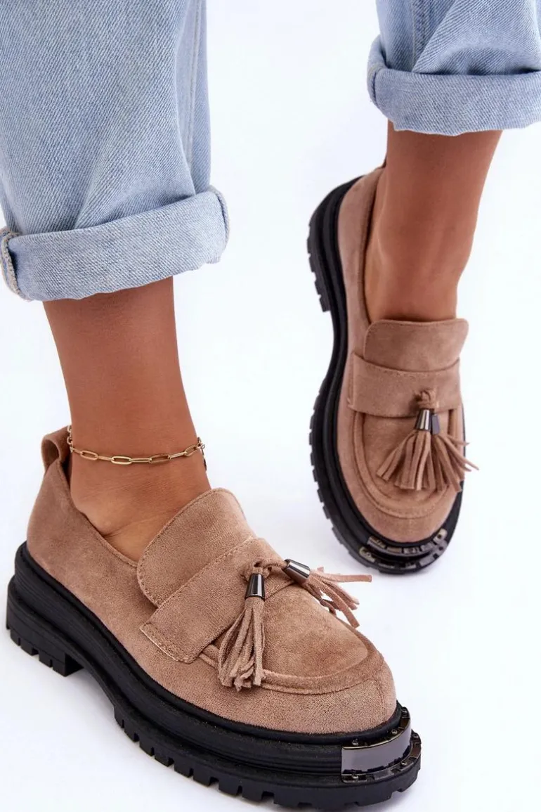 Damskie mokasyny to idealne obuwie na wiele okazji! Wykonane z eko zamszu. Osadzone na płaskim obcasie oraz platformie. Noski zaokrąglone. Przód ozdobiony paskiem z frędzlami. Miękka eko skórzana wkładka zapewni komfort podczas użytkowania. Dodatkowo zapiętek jest usztywniony. Ten model z pewnością przypadnie Ci do gustu! Przy wyborze rozmiaru prosimy sugerować się tabelą rozmiarów.
