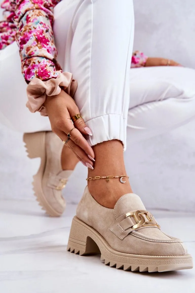 Te półbuty to HIT sezonu ! Wykonane z naturalnego zamszu. Posiadają masywny obcas w postaci słupka oraz platformę wykonaną z antypoślizgowego, gumowego tworzywa. Ozdoba na przodzie została wykonana z tworzywa sztucznego. Nosek zakryty, kwadratowy. Pod językiem znajduje się gumka, która pozwoli na odpowiednie dopasowanie obuwia do tęgości nogi. Usztywniany zapiętek. Wkładka skórzana zapewni komfort podczas użytkowania. Ten model będzie pasować do wielu stylizacji! Przy wyborze rozmiaru prosimy sugerować się tabelą rozmiarów.